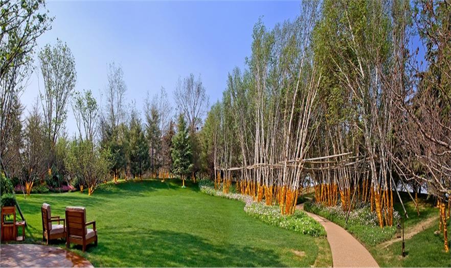 DDON•笛東設(shè)計(jì)團(tuán)隊(duì)在對(duì)場(chǎng)地規(guī)劃、建筑類型及圍合方式分析的基礎(chǔ)上,確定景觀布局方式。以水系為主的中心景觀軸與混交的環(huán)形林蔭主環(huán)路,形成別墅區(qū)的整體景觀框架,在保證私家庭院最大化的前提下,通過(guò)多重植物景觀的營(yíng)造,保證庭院對(duì)私密性的要求。公共空間采用“小中見(jiàn)大”的設(shè)計(jì)方式,利用植物夾道的小徑和開放場(chǎng)地的交替變化。