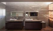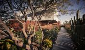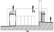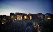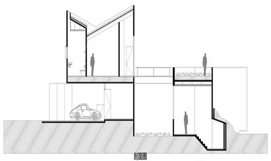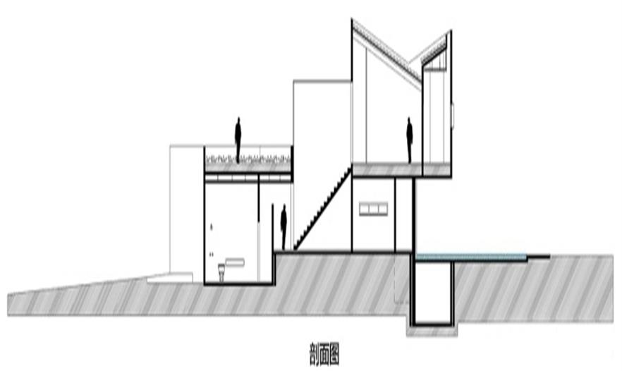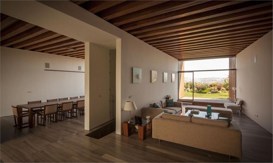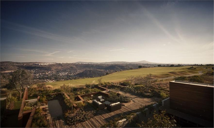 朝向道路和周圍建筑附近是一個鮮有開口的混凝土體塊。朝向遠處景觀和高爾夫球場有一系列體量框定出無邊無緣的景觀。