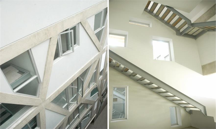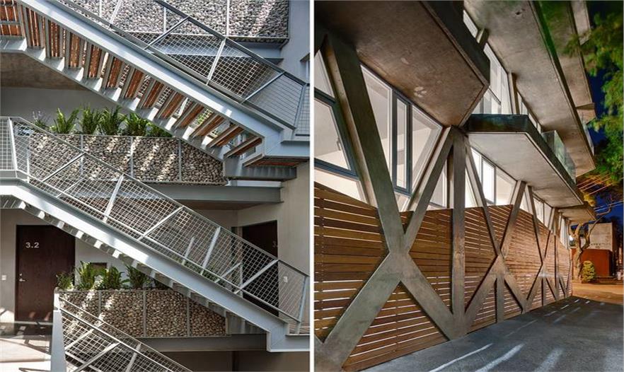 項(xiàng)目有廢物處理與回收單元,對環(huán)境負(fù)責(zé)。分組串聯(lián)式系統(tǒng)用來收集雨水,在污水凈化廠處理過后重新用于清洗廁所和階梯。公寓之間的室內(nèi)墻壁由草捆制作而成,結(jié)構(gòu)設(shè)計(jì)受到該地區(qū)本土植被的啟發(fā),材料數(shù)量及其抵抗性得到優(yōu)化利用。