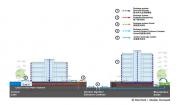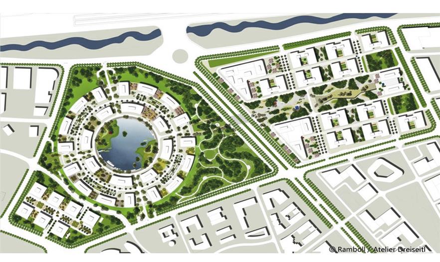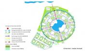 On Plot A the buildings are organized in a circle around a central lake surrounded by a thick band of green and an existing park. The lake shore is lined by steps that invite people to relax in the lunch break. A concentric row of trees and radial planting beds between the steps add additionally to the outdoor quality flair. Two green peninsular opposite to each other will become important habitats for wet-loving flora and fauna. Plot B is more oriented towards the main central avenue. The almost symmetrical arrangement leaves a generous gap between the two building clusters and forms a green park-like axis on which end the central building with its two towers stands. The western side of this middle axis gives a park feeling. Planting islands and extensive lawn areas give a strong contrast to the strict geometrical shape of the buildings.