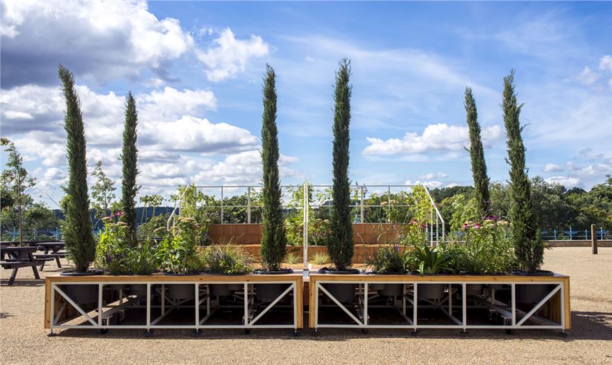 一種是散落的、延展的結(jié)構(gòu),為體驗(yàn)花園提供了多種不同的觀賞角度。這種結(jié)構(gòu)作為平臺(tái)的一般功能使用,為游客提供休息和坐下享用酒吧提供茶點(diǎn)的機(jī)會(huì)。