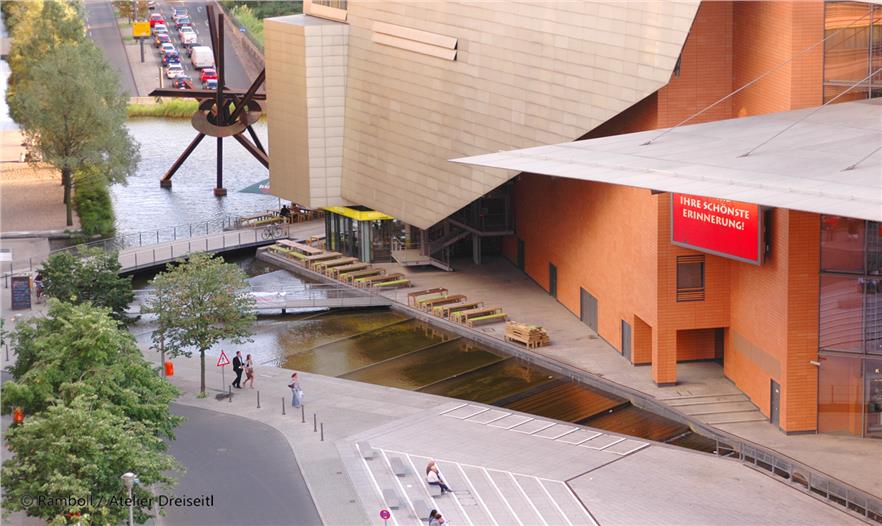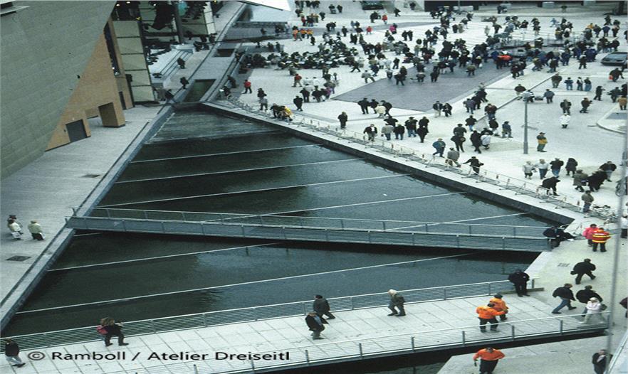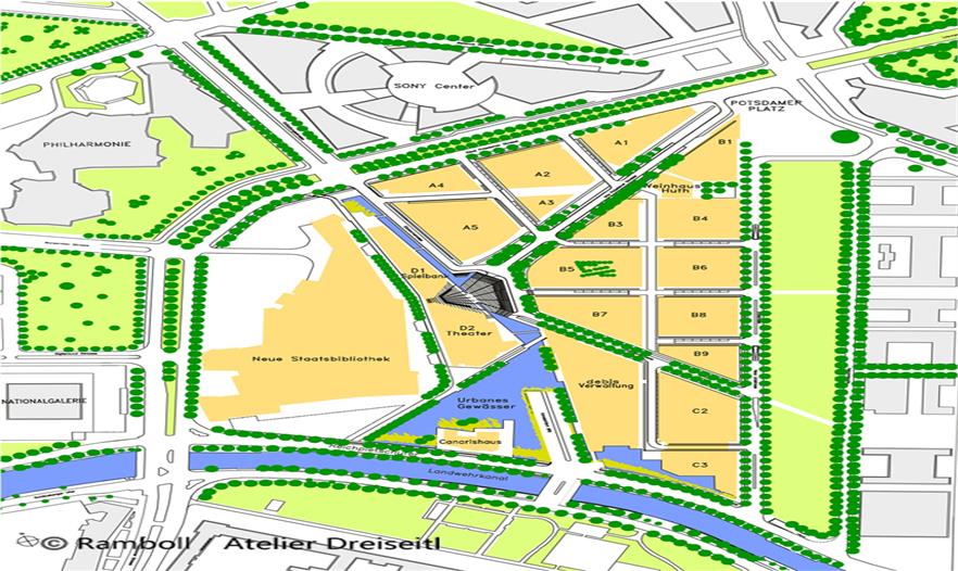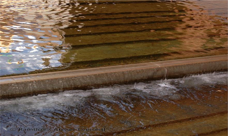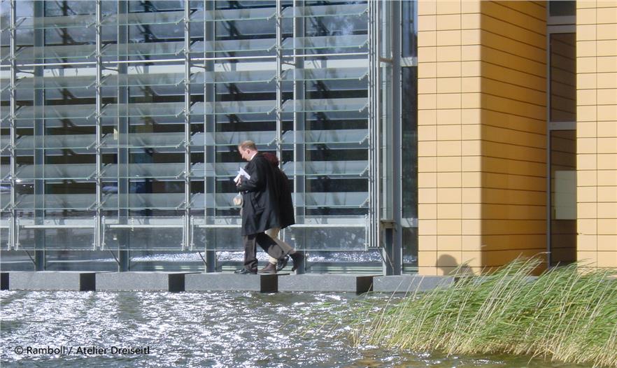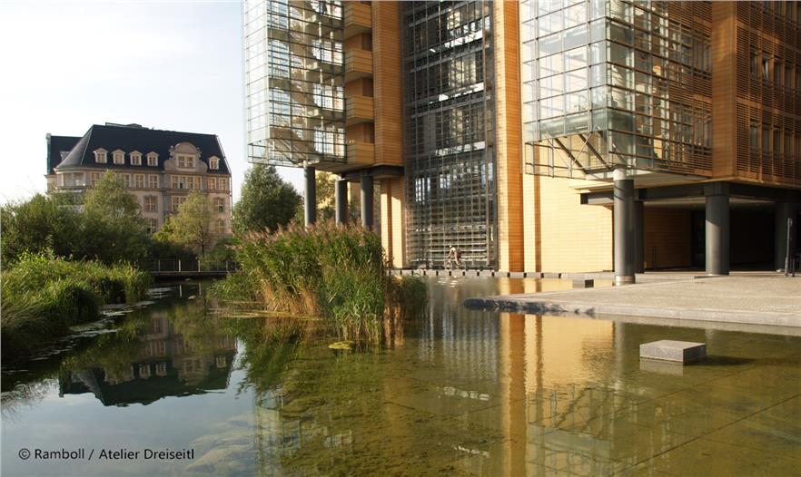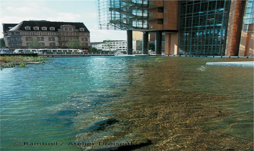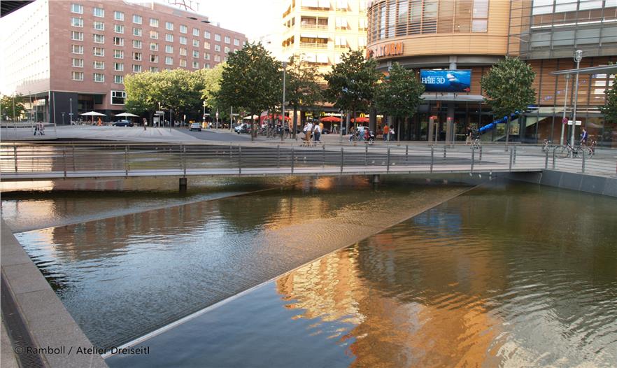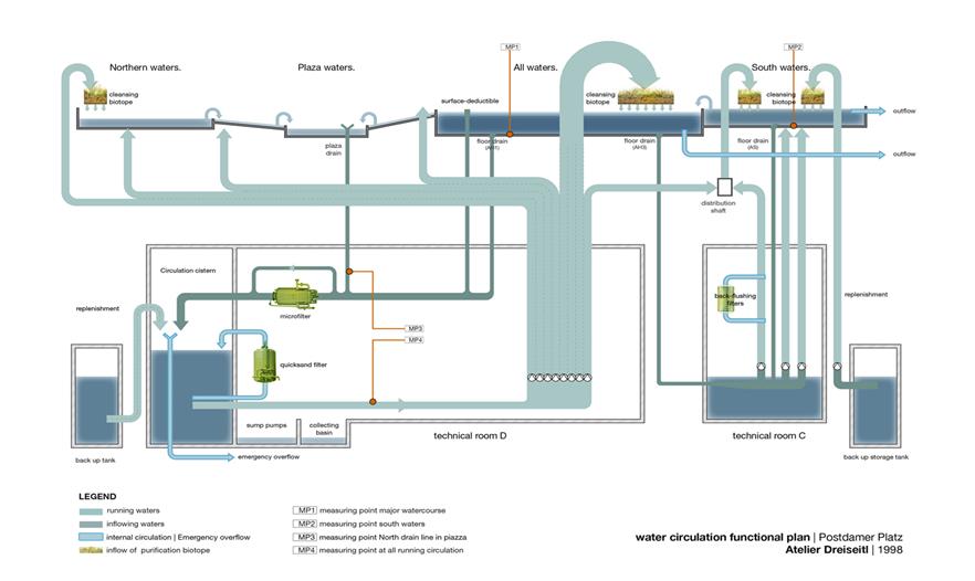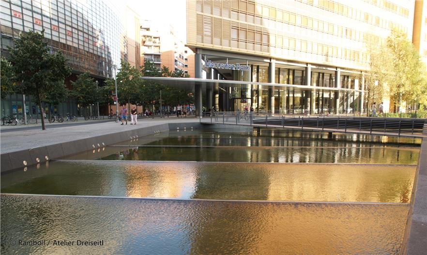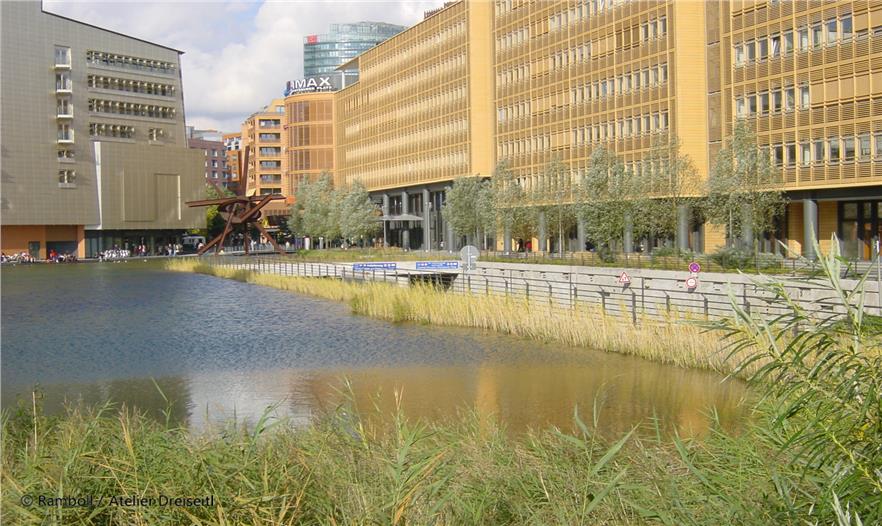 Herbert Dreiseitl had already worked on Potsdamer Platz immediately after the Wall came down, with an Anglo-German planning team. The theme of water as a defining element in the open space had convinced both the Senate and the investors from the outset. First of all the design possibilities caught their imagination, and secondly they were fired by the chance of meeting the ecological challenges. The suggestion that rainwater should be used for flushing toilets and watering green areas was met with interest. The same was true of the idea of using the rainwater that collected in the underground tanks to feed a water system that would include a narrow pool on the northern side, one in the piazza, the large main area of water and the southern area of water. Additionally, this offered the opportunity not to lower the groundwater during the building phase and to make an intermediate collection of all the rainwater that fell on the buildings and slowly feed it into the Landwehrkanal.
