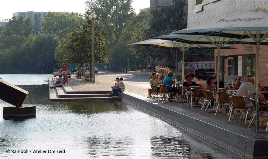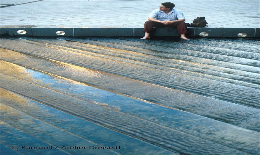 The iconic Potsdamer Plaza bridges the scar left by the wall between East and West Berlin. A veil of shallow flow-steps create a rhythmic surface of shimmering waves, providing multiple opportunities for people to cross and interact with the water. This urban waterscape has contributed to make Potsdamer Plaza one of the most visited places in Berlin, which achieved 2011 DGNB Silver Sustainable Urban District Award after more than 10 years of its completion.