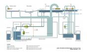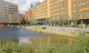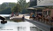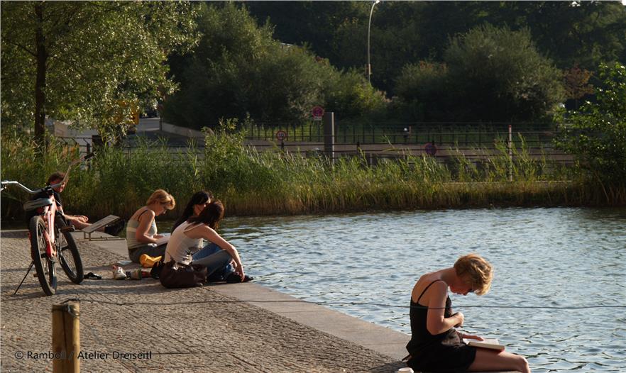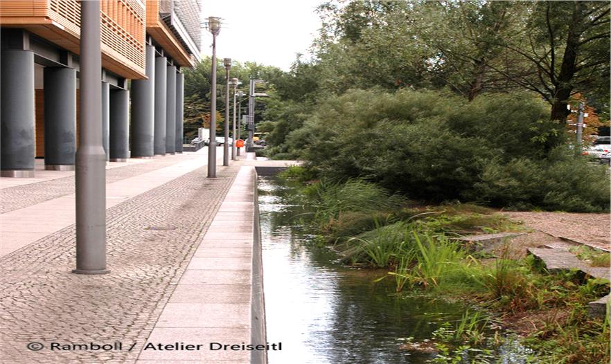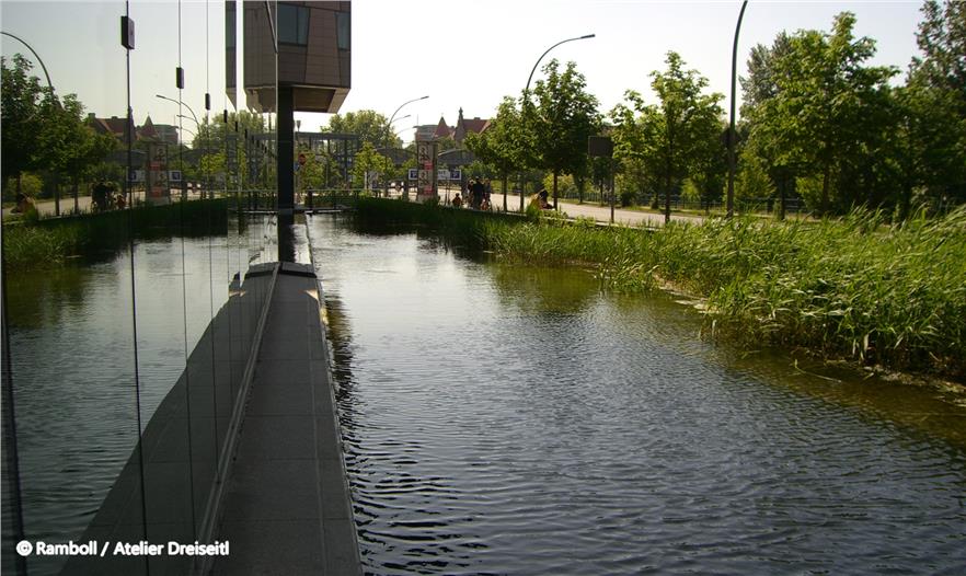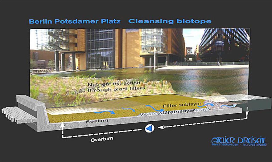 A complex computer simulation was used to predict that the Landwehrkanal would only be compelled to absorb heavily increased amounts of precipitation three times in ten years; this is based on the approximate drainage figures for an unsealed plot. To guarantee this, the system must carry sufficient buffer capacity. This is provided in the first place by five underground tanks with a total volume of 2,600 cubic metres, of which 900 cubic metres are left free in their turn for cases of heavy precipitation. In addition to this, the main area of water can still offer a reserve of 15 centimetres between the normal and the maximum water level, which provides a storage buffer of 1,300 cubic metres. A key feature was the water resources that were discovered above the turbidity level of the main area of water. Solids can start to settle in the underground tanks before the water flows out of source vessels on the banks of the south and main areas of water, through planted purification biotopes, where it is cleaned biologically and chemically.