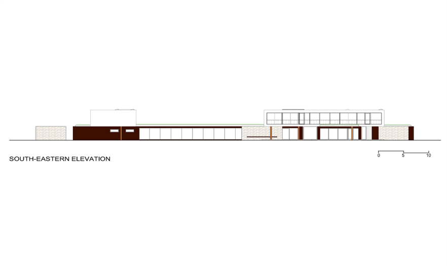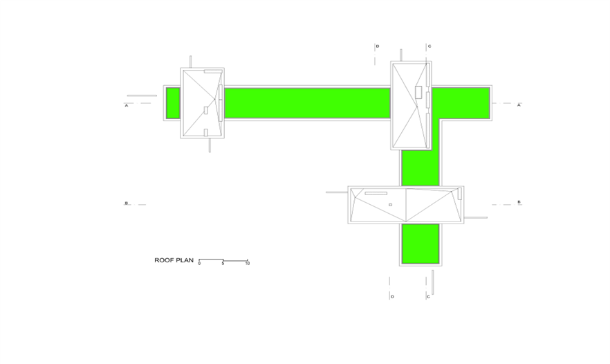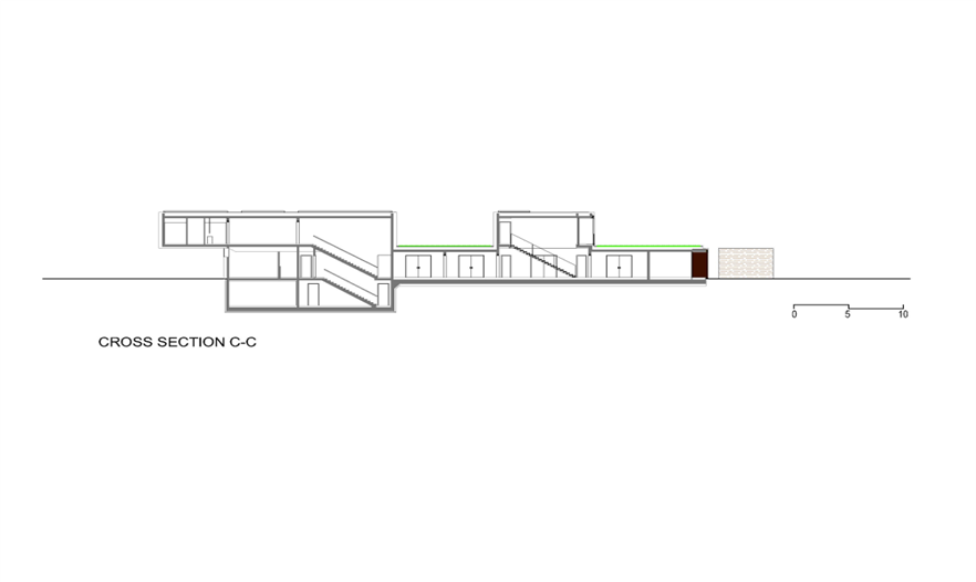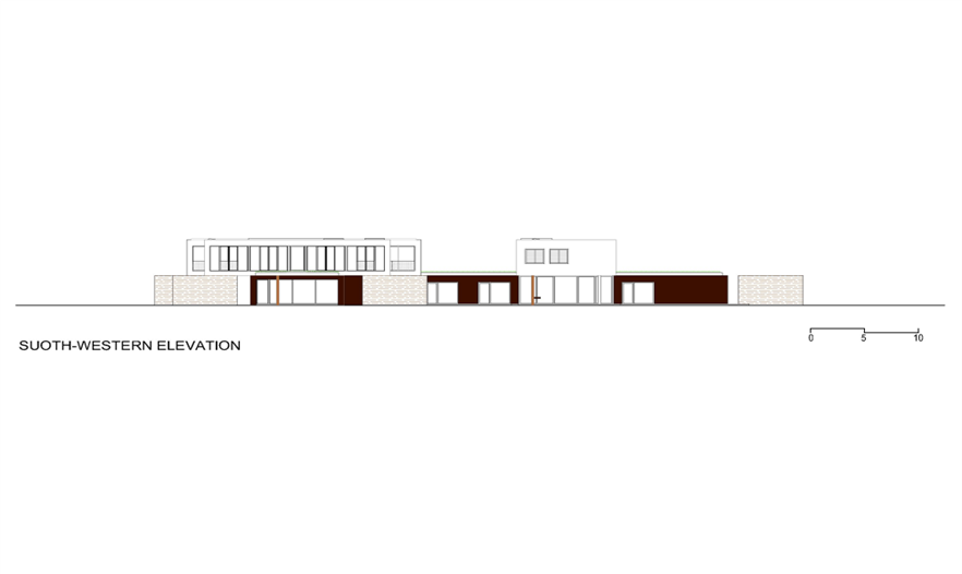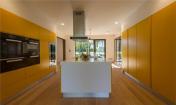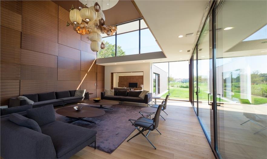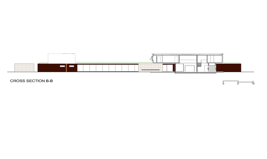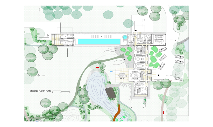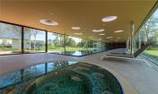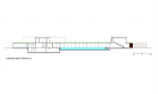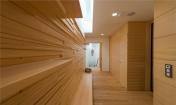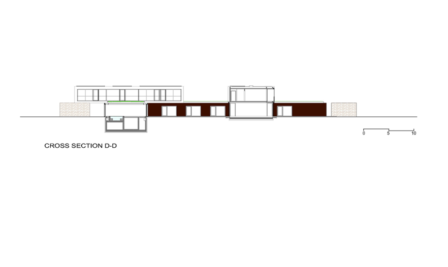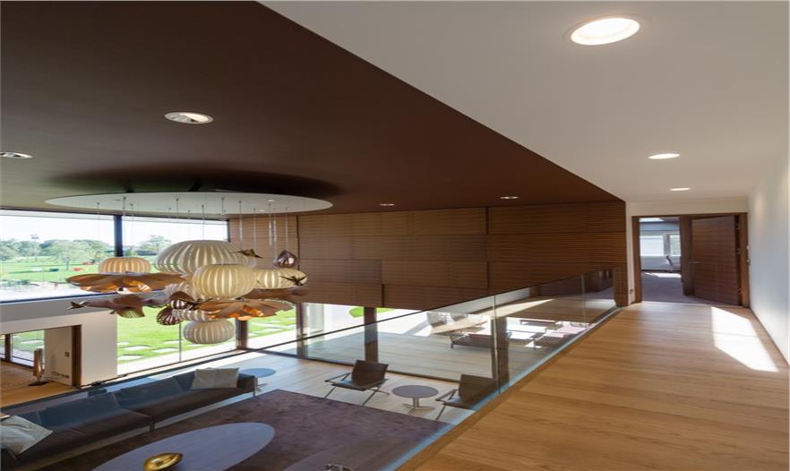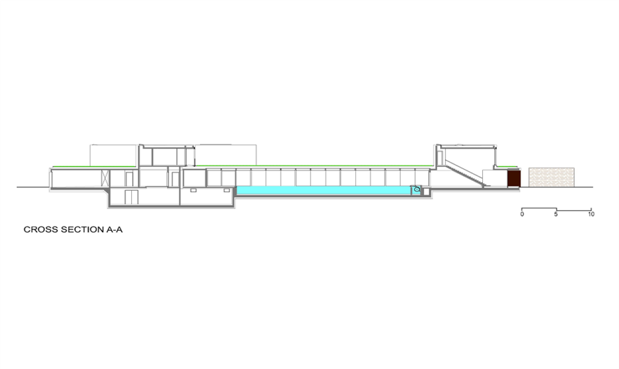 在一樓,這座別墅是“L”型的,有2個(gè)側(cè)翼。在主要的地面空間的頂端有3個(gè)獨(dú)立的樓層結(jié)構(gòu),其中的2個(gè)和它垂直,而第3個(gè)位于兩翼的交叉處。樓層結(jié)構(gòu)強(qiáng)調(diào)和包括入口和相同的構(gòu)造。地下室包括機(jī)房和水池的技術(shù)。一樓的西南翼包括服務(wù)設(shè)施、水池區(qū)域、衣帽間、客人和外來游客使用的入口。東南翼包括房主的居所,或許通過大型的滑動(dòng)門將其分離或是聯(lián)合。南部的樓層結(jié)構(gòu)是客房,有2個(gè)臥室和一個(gè)套房。北部的樓層結(jié)構(gòu)是休閑區(qū),有健身房、桑拿室和放松區(qū),東部的樓層結(jié)構(gòu)是家庭的休息室。