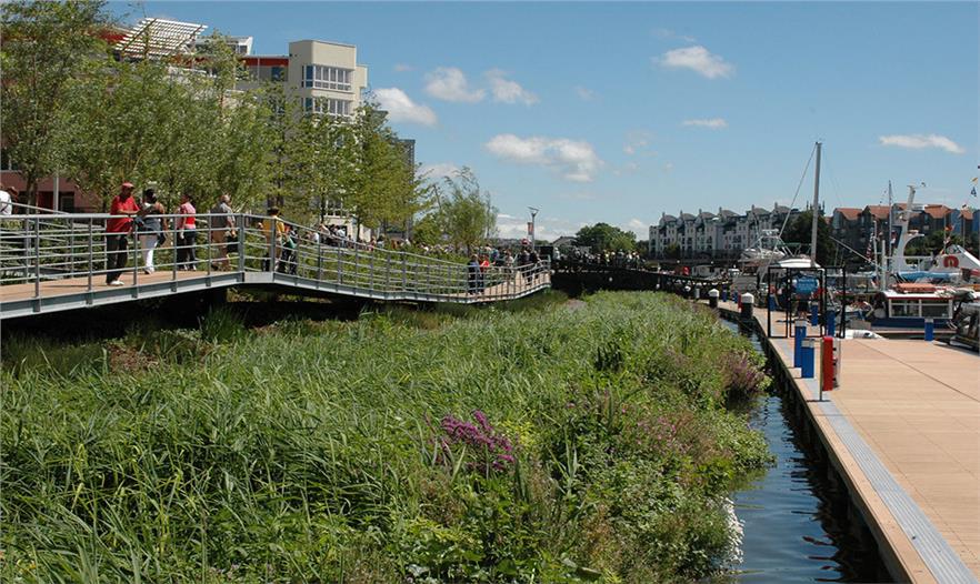 可持續(xù)城市排水: 可持續(xù)城市排水將雨水從建筑屋頂導(dǎo)流至港口,通過一系列管道、渠道和小溪,還可以灌溉種植。浮動的海港邊緣蘆葦在水進入港口之前過濾雨水和地表水。蘆葦也創(chuàng)造了寶貴的棲息地,并提供一個有吸引力的水邊設(shè)置。其他棲息地包括面對中央廣場的綠墻。