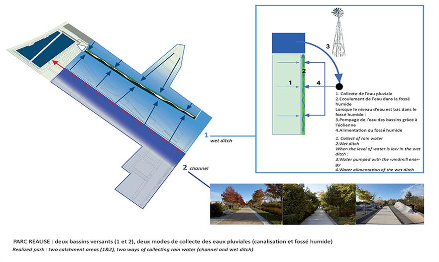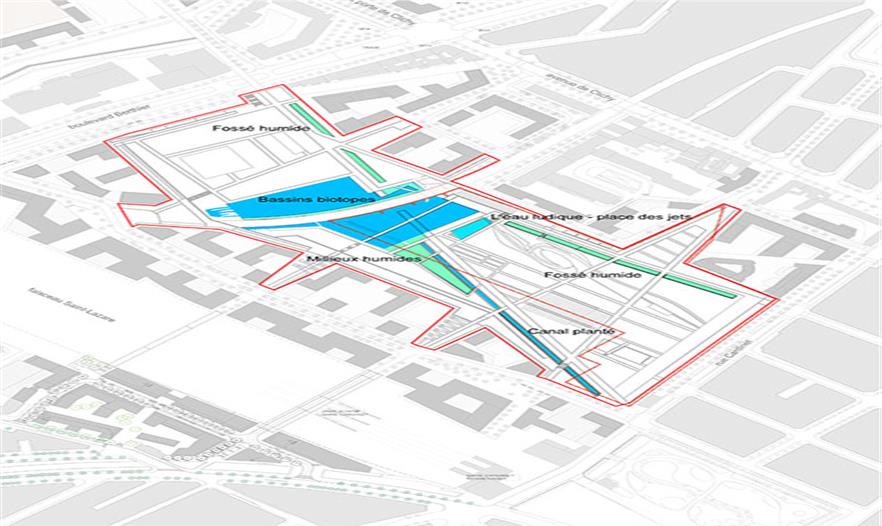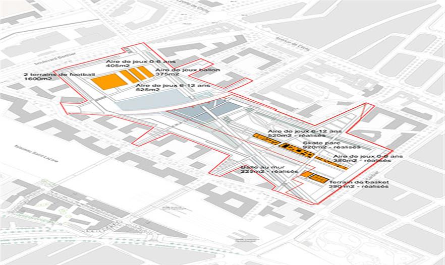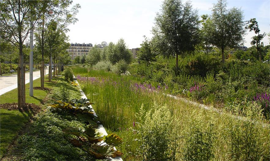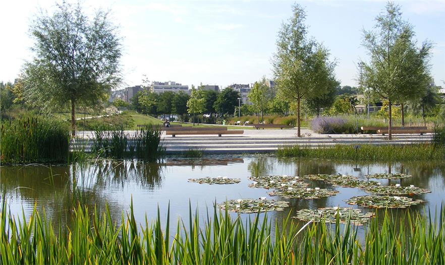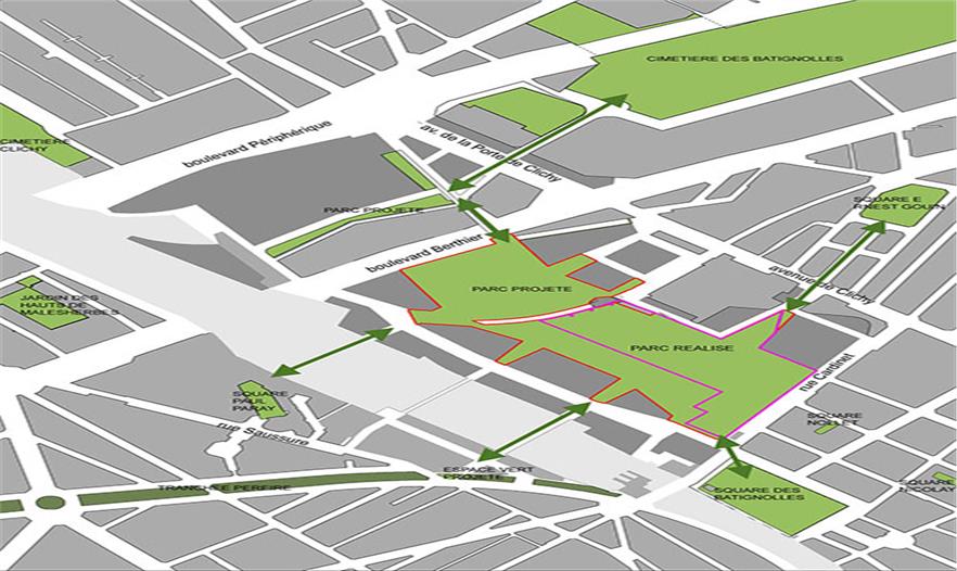 整個(gè)的城市區(qū)域占地45公頃,包括一個(gè)10公頃的公園。第一階段包括4.3公頃的花園項(xiàng)目,已于2007年完工。一個(gè)新區(qū)域的建立者Parc des Batignolles符合未來的城市形式。它的路線通過連接街區(qū)和現(xiàn)有的綠色空間使城市得以擴(kuò)展延伸。南北東西走向的城市道路以植被走廊的形式在公園里擴(kuò)展。這個(gè)公園建在一個(gè)火車站臺上,除了西面的臺地和斜坡因需要橫跨St-Lazare鐵路網(wǎng)要進(jìn)行調(diào)整外,保留了所有原始的水平地形。在中心,這個(gè)公園延伸到一個(gè)水裝置的兩邊,而這個(gè)水裝置把保留下來的巴黎內(nèi)環(huán)鐵路線隔離開來。