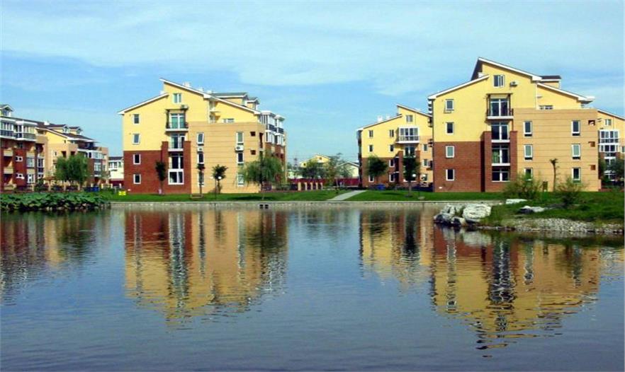 站在社區(qū)最高處,碧水藍天之間,一棟棟秀麗端莊的小樓次第座落,灰色的屋頂,米黃色的樓體,紅色的廊柱,掩映在綠樹繁花之中,顏色分外和諧。東方太陽城根據不同的家庭類型貼身設計了不同的建筑形式。