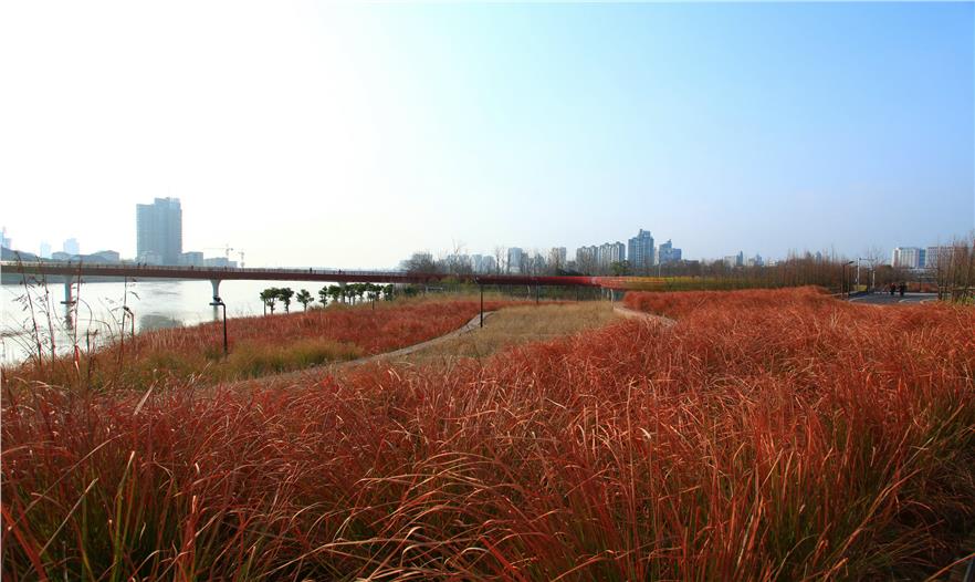 經(jīng)過兩年的設(shè)計(jì)和施工,燕尾洲公園獲得了巨大的成功。2014年5月開園后,萬人空巷,游人如織。據(jù)安裝在步行橋頭的進(jìn)出口自動計(jì)數(shù)器顯示,步行橋的日使用人數(shù)平均達(dá)4萬余人次。當(dāng)?shù)孛襟w驚呼 “一座城市為一座橋而發(fā)狂”。 目前,燕尾洲公園已經(jīng)成為了金華城市的一張新名片。同時(shí),這一工程探索了彈性景觀的設(shè)計(jì)途徑,通過與洪水為友的生態(tài)防洪堤設(shè)計(jì),適應(yīng)于旱澇的植被設(shè)計(jì)和百分之百的透水鋪裝設(shè)計(jì),來實(shí)現(xiàn)景觀的生態(tài)彈性功能;通過可達(dá)性良好、多坡道和泛適用的步道系統(tǒng)及步行橋的設(shè)計(jì),將被分割的城市連接為一體,促進(jìn)社區(qū)交流,使公園成為聚人的場所。設(shè)計(jì)通過“大中見小”的空間設(shè)計(jì)策略,將大型文化表演類場所的瞬時(shí)人流曠廣空間巧妙地化解為平時(shí)市民使用的靜謐空間,發(fā)揮了景觀的社會彈性功能;同時(shí),吸取鄉(xiāng)土文化傳統(tǒng),重建被割裂的文化脈絡(luò),強(qiáng)化地域文化認(rèn)同,發(fā)揮了景觀的文化彈性功能。