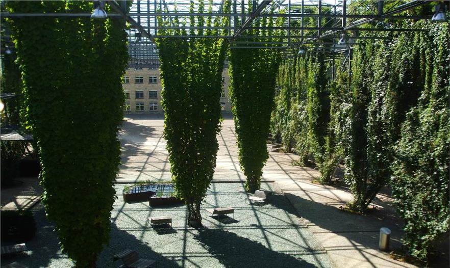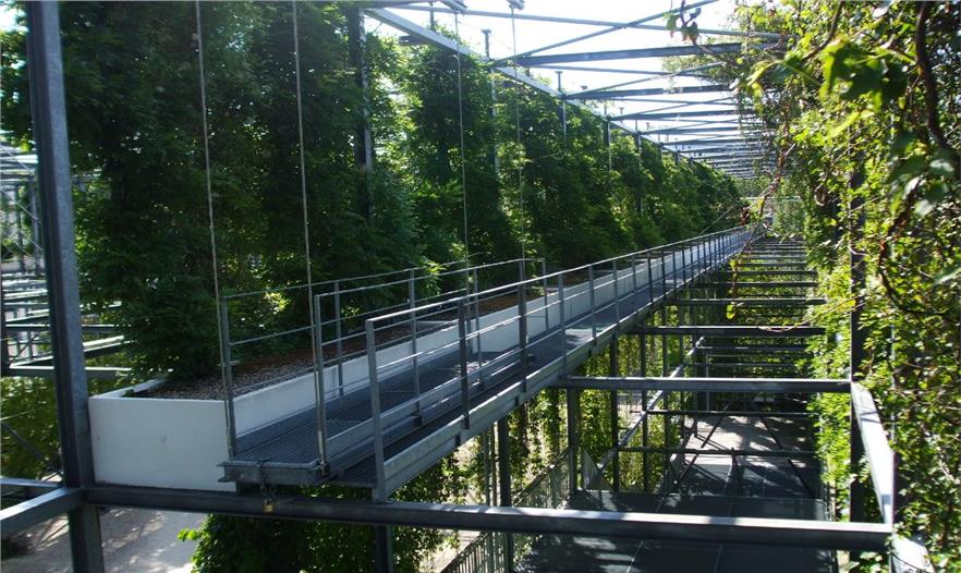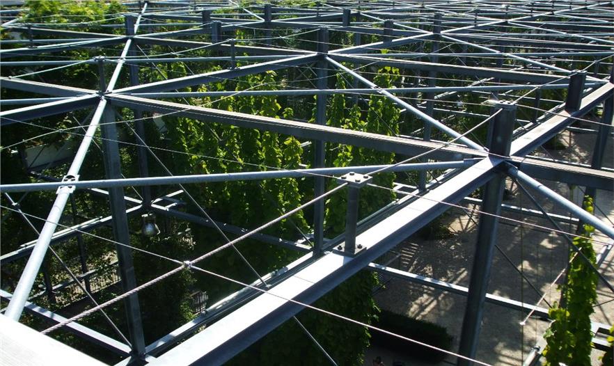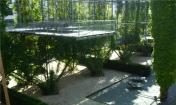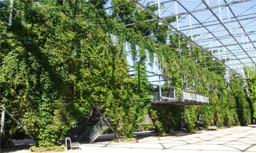 巨大的花園式房屋是一個(gè)雙層式建筑,用鐵絲網(wǎng)覆蓋,是典型的老式園藝格子風(fēng)格,整個(gè)建筑被蔓生的植物包圍,房屋三面向外開(kāi)放。寬敞的大廳中有個(gè)藤蔓植物叢,苔蘚地上扦插著幾個(gè)水池,雙層墻的間隙由臺(tái)階,有蓋走廊,陽(yáng)臺(tái)連接。在最頂端的是太陽(yáng)板。一座布局精確,設(shè)計(jì)嚴(yán)謹(jǐn)?shù)慕ㄖ痛顺霈F(xiàn)了,伴隨它的還有雅致的植物盆景,內(nèi)部綠意盎然,芳香四溢,使人心曠神怡。