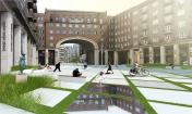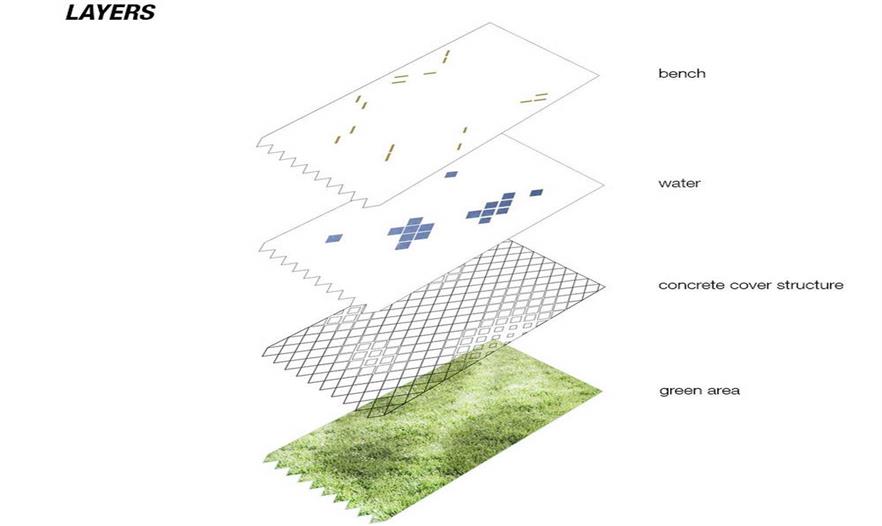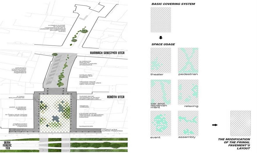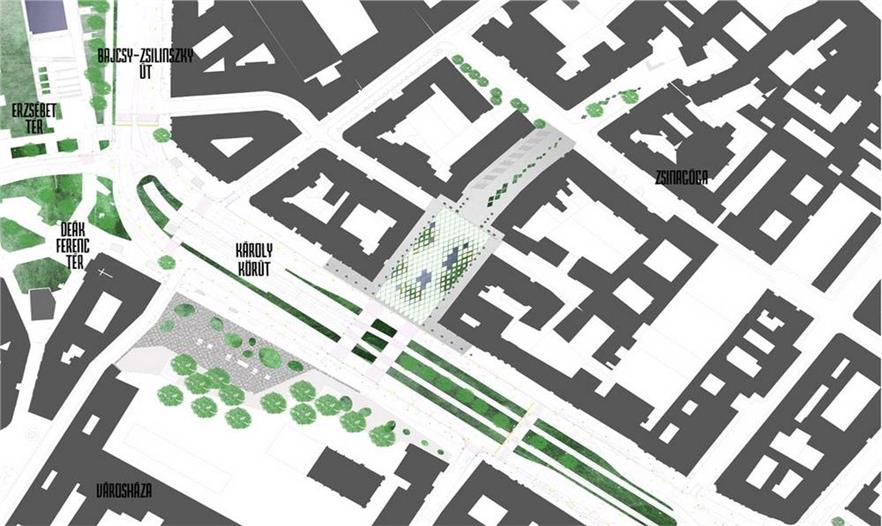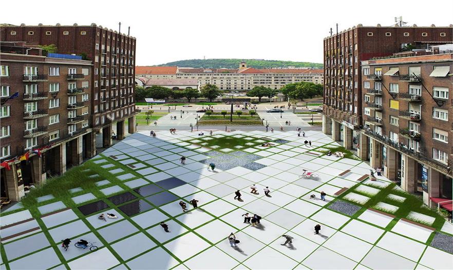 一個學(xué)生競賽把坐落在布達佩斯中心的Madách廣場從停車場轉(zhuǎn)變成為一個適應(yīng)現(xiàn)狀的多用途廣場。為了增大綠化面積又保證路面的足夠面積,他們創(chuàng)建出一種新路面樣式。植物就總在規(guī)律變形的廣場磚之間。在某些地方,廣場磚變成水磚“呈同樣變體規(guī)律的水景盒子”。綠色植被,水景,路面交錯,根據(jù)不同的位置呈現(xiàn)出某個元素的強或者弱。實現(xiàn)了一個十分整體,同時富于變化且有趣的廣場。