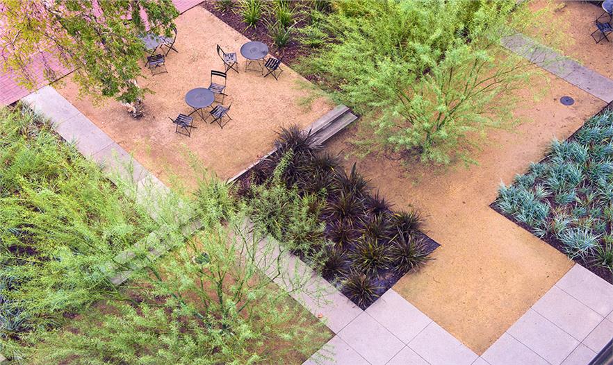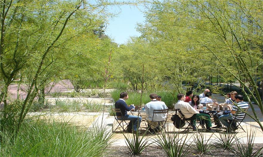 加州理工大學(xué)的安尼伯格信息科學(xué)與技術(shù)中心為科學(xué)和工程學(xué)的合作研究和指導(dǎo)提供了一個現(xiàn)代化的中心。這個設(shè)施代表著加州理工大學(xué)可持續(xù)性發(fā)展規(guī)劃的最新動態(tài),目前正在接受綠建筑黃金認(rèn)證的評估。該建筑周圍的景觀反應(yīng)出了環(huán)境倫理,展示出對傳統(tǒng)的帕薩迪納市裝飾組合實(shí)質(zhì)性的轉(zhuǎn)變。帕洛貝爾德樹構(gòu)成了這個建筑的入口植物,被組織到一系列的木板中,與鄰近的玻璃立面相映襯。下層植被灌木主要作用是節(jié)水,由一系列的肉質(zhì)植物和觀賞草構(gòu)成。這個項(xiàng)目也包括一個顯著的社交元素——風(fēng)化的花崗巖座位區(qū),還帶有移動性的裝置,用于即興的戶外聚集地。這個帶有節(jié)水效益的新環(huán)境美學(xué)深受大學(xué)校園社區(qū)的喜愛。