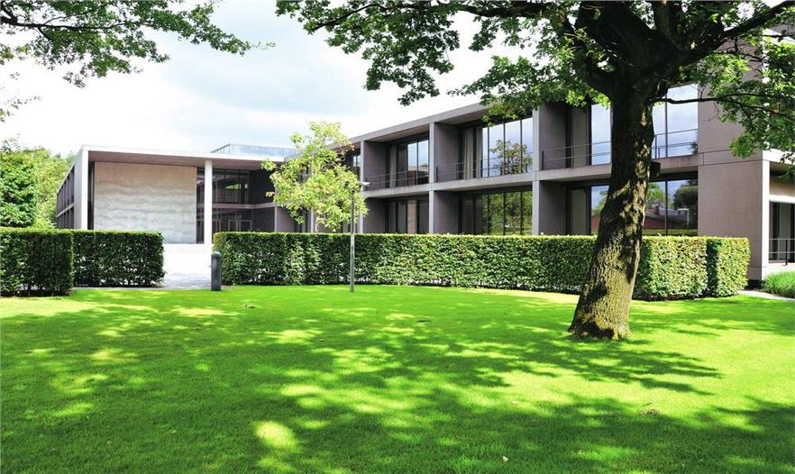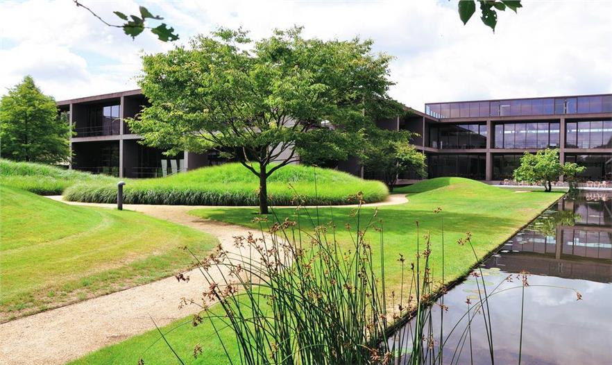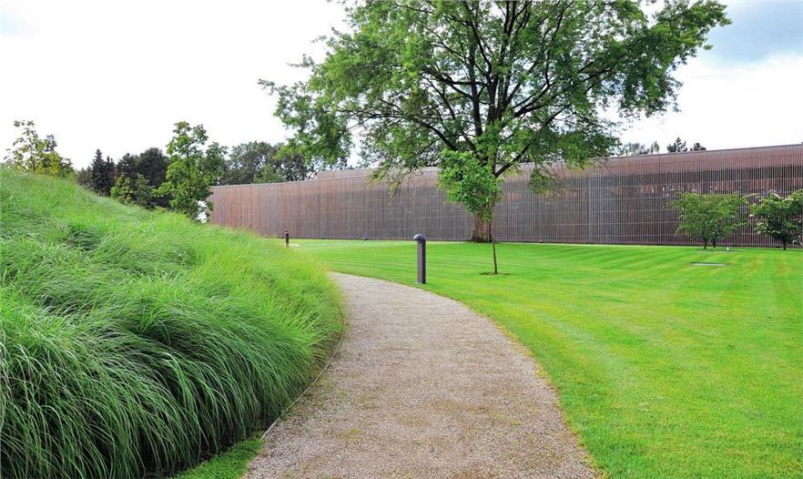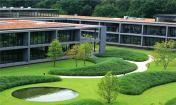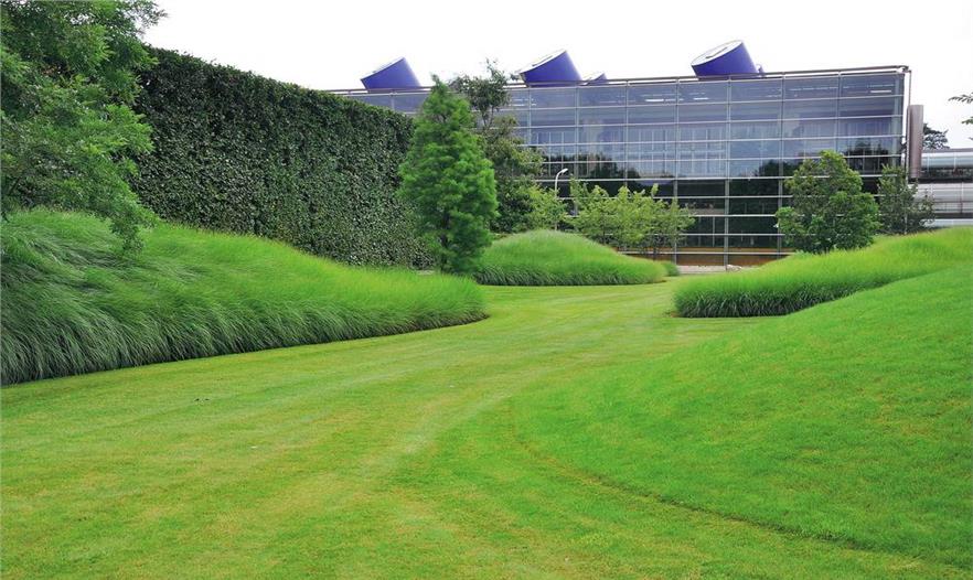 項目為德國西部的一家服裝零售公司Ernsting’s Family的總部空間設計,包括中央辦公樓和倉庫。如何將所有的建筑物融合在一個空間里并賦予其姿態(tài)美感,成為設計的一個挑戰(zhàn)。基本結(jié)構(gòu)為曲線小徑蜿蜒于草丘間,觀賞草、水景小品和不同樹木的配置形成軟景。靜謐的景觀氛圍,圓形的柔軟特色,幾何建筑得以對話并共同生活在這個公園環(huán)境里。