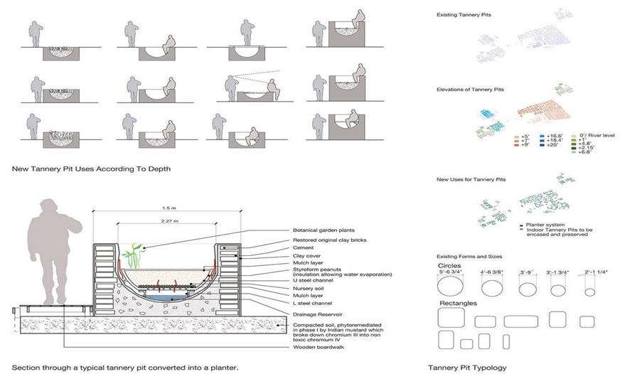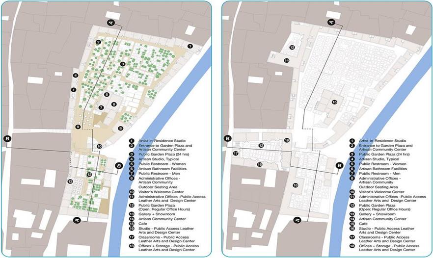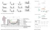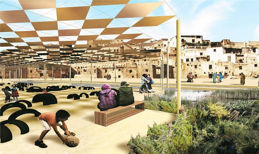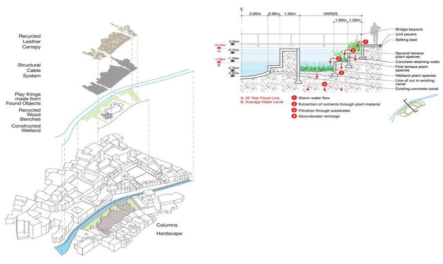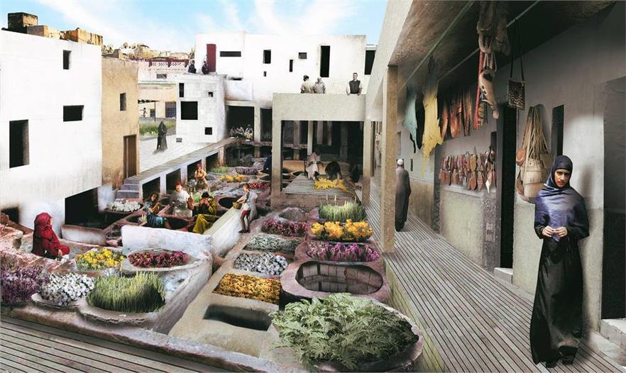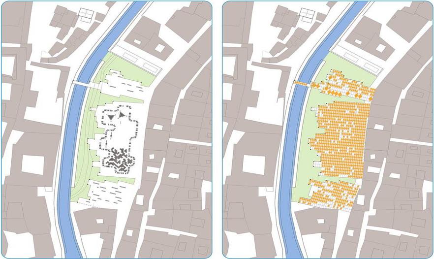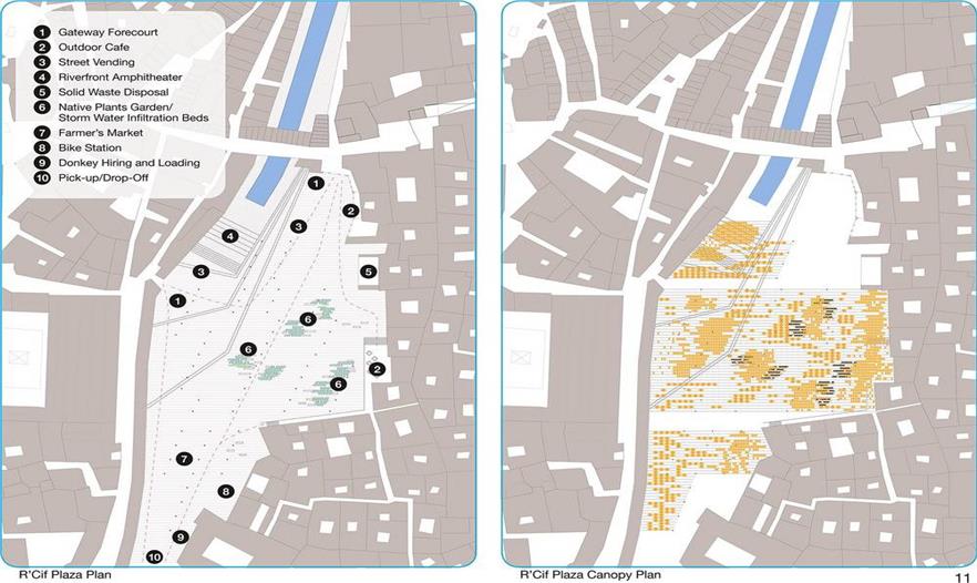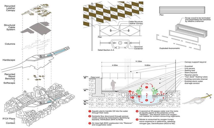 設(shè)計團隊與菲斯市水電局合作,系統(tǒng)地分析了舊城區(qū)及其周邊的城市生態(tài)背景,制定了分期施工的策略,尤其是改善水質(zhì)的措施成為解決城市里社會和經(jīng)濟等問題的核心。項目分為兩類規(guī)模:城市規(guī)模和場地規(guī)模。城市規(guī)模(包括新城區(qū)和舊城區(qū))方面,項目涉及總體規(guī)劃及提高區(qū)域水質(zhì)的各項措施。依據(jù)土壤地貌、水污染程度、附近的城市肌理和生態(tài)系統(tǒng)制定不同的修復(fù)方案,如復(fù)原運河、建造濕地、修復(fù)堤岸、雨水蓄水池。場地規(guī)模(舊城區(qū)的一些地塊)方面,項目涉及分期建造的三棟建筑物,旨在提高水質(zhì)、修復(fù)受污染的場地、建造開放空間、增建有利于經(jīng)濟發(fā)展的資源。陽光普照的時候,河流北部的三棟建筑物以空地的優(yōu)勢重新融入了城市肌理。將Rcif的建筑物設(shè)計為主要交通樞紐與人行步道循環(huán)系統(tǒng)的節(jié)點,同時還能過濾雨水徑流。安達魯斯場地的建筑物和濕地成為舊城區(qū)的首個兒童游樂園。最終,曾經(jīng)建筑林立的景象會不復(fù)存在,在高污染制革廠舊址上建造區(qū)域植物園和新型技術(shù)設(shè)計研究所,后者與留存下來的卻毫無生氣的皮革業(yè)息息相關(guān)。項目的整體效果在于抬升河道,賦予其城市基礎(chǔ)設(shè)施的形式,進而使河道在二十一世紀人口和城市形式留存這兩種需求之間起到連接和填補的作用。