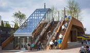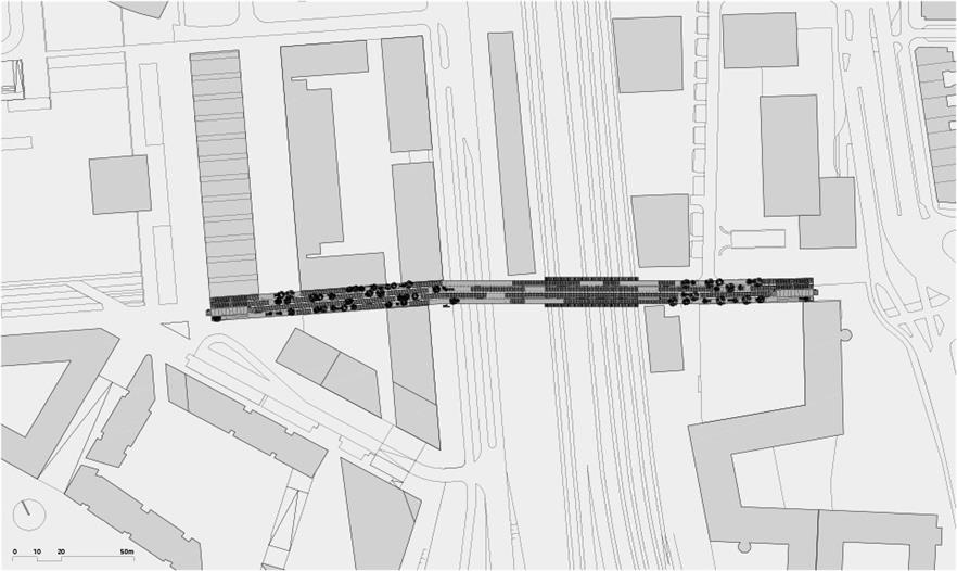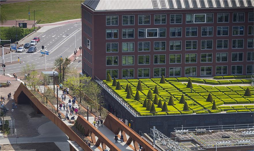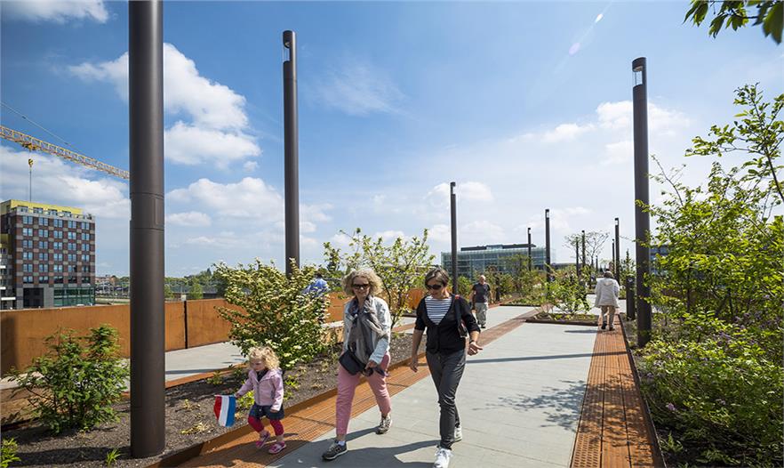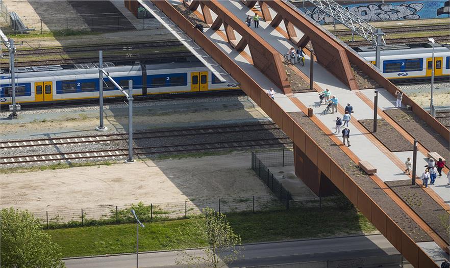 Paleisbrug,是一座橫跨鐵路,長度達(dá)到250米的人行+自行車天橋公園后工業(yè)景觀設(shè)計(jì),其聯(lián)系了新開發(fā)區(qū)Paleiskwartier中的各個(gè)大學(xué)研究機(jī)構(gòu),辦公室,住宅。同時(shí)橋體上還配備了大型的太陽能集熱器以便為周邊地區(qū)提供能源。天橋公園所在地斯海爾托亨博斯因?yàn)檫^去戰(zhàn)爭防御工程的建設(shè),很長時(shí)間一直被壯麗的自然風(fēng)景淹沒,大量土地尚未開發(fā),如今已成為瀕臨市區(qū)的景觀與歷史福地,人們上行到橋上可以飽覽周邊美景。
