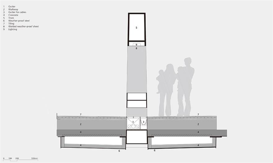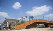 建筑師采用紅銹色的耐候鋼板作為主材料。耐候鋼板除了成為結(jié)構(gòu),其還蔓延折疊翻轉(zhuǎn),成為了樹池,地面,座椅,燈具。該材料抗腐蝕性能相當(dāng)良好,每百年才會被腐蝕0.5毫米,可謂防風(fēng)防雨的絕佳材料。同時(shí)其強(qiáng)勁的外形與場地防御工程背景不謀而合。