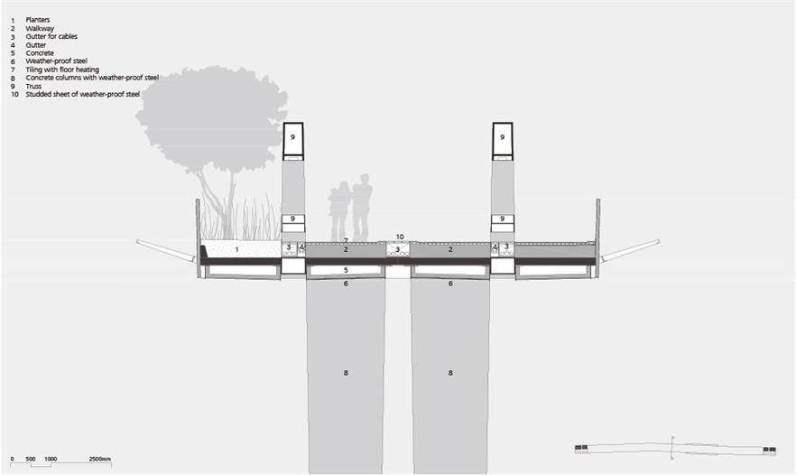 為了讓殼體在冬季不結(jié)冰,建筑師設(shè)置了太陽能集熱器在夏天手機(jī)熱量,在冬天釋放出來,保證了行人經(jīng)過橋面的安全,此外多余的熱量還可供周邊地區(qū)使用。