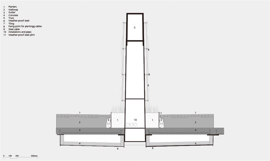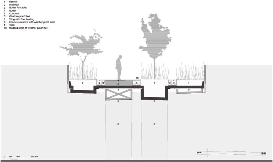 喬木,灌木,地被在橋上按區(qū)域井井有條的分布,在橋兩側(cè),主要種植著喬木,橋的橫跨結(jié)構(gòu)上則重要種植低矮植被。所有植物采用滴灌系統(tǒng)灌溉,同時(shí)設(shè)置溢流管防止水淹。夜間照明也保證了公園24小時(shí)舒適。這里成為了城市中一個(gè)有特色的生態(tài)系統(tǒng)。