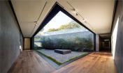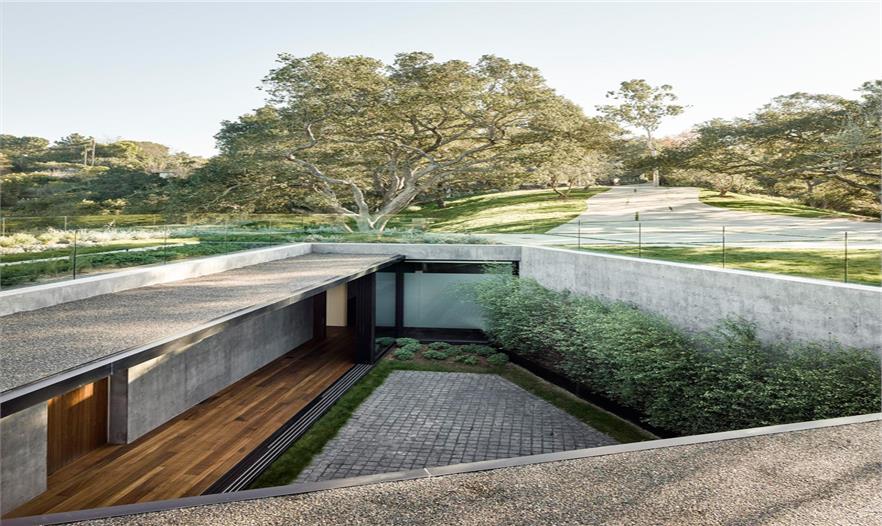 設計師通過采用倒置的規(guī)劃方案減少了占地面積,將公共空間建在臥室上,掩藏于山體中,還有一個植被繁茂的屋頂作為保護層。光線能通過較低的庭院射入到臥室層的走廊上,空氣也能自由流動。
