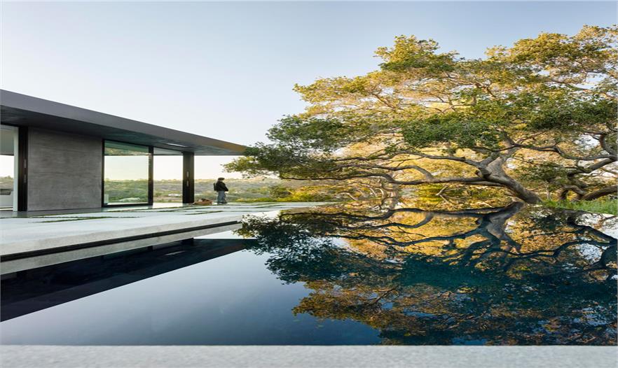 在該區(qū)域其中最大的一棵橡樹下面有一個75英尺長的游泳池,將房屋一分為二。
