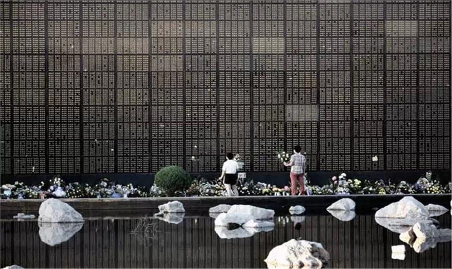 • 遺址和作為靜默哀悼的樹林之間的對位關(guān)系,水池和樹木之間以紀(jì)念墻和紀(jì)念甬道為軸線,兩側(cè)一動(dòng)一靜的關(guān)系處理得很好,力量感很強(qiáng)。