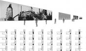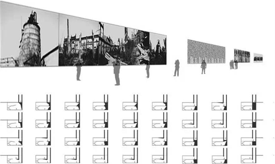 • 在縱軸的基礎(chǔ)上,又增加一個(gè)橫軸,在手法上更現(xiàn)代一些,更前衛(wèi)一些。紀(jì)念墻的設(shè)計(jì)體現(xiàn)出多而豐富的可能性,周邊展覽的空間擴(kuò)展的可能性大。