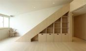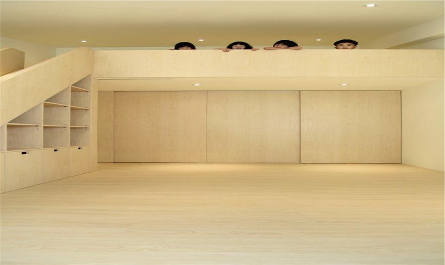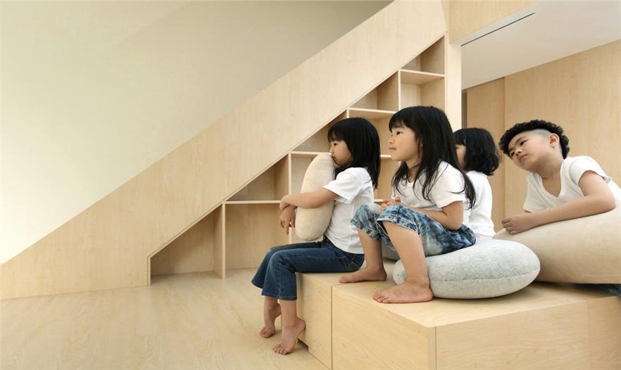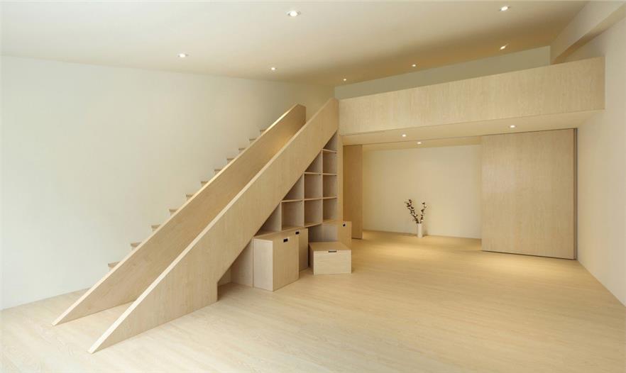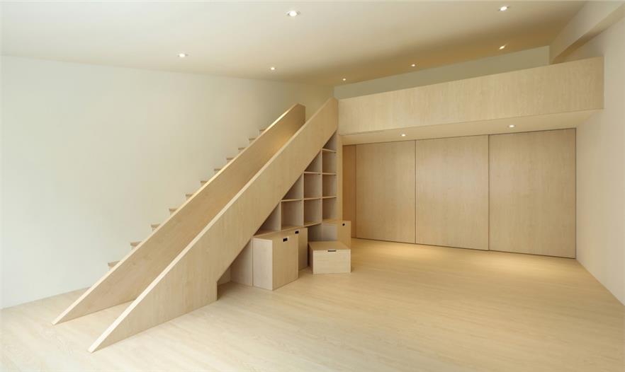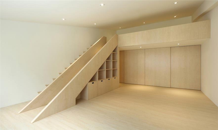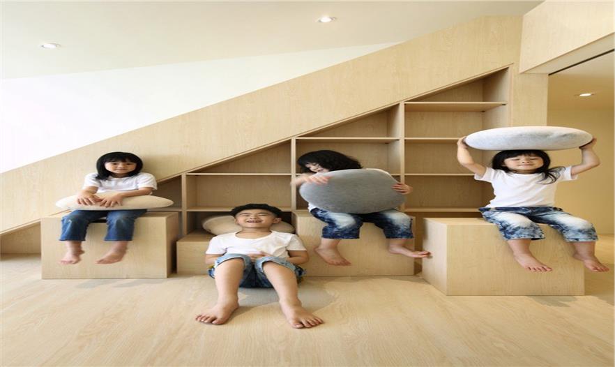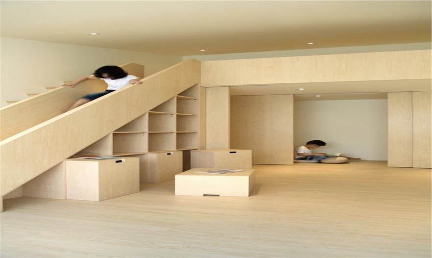 閣樓里的這個(gè)階梯和滑梯是這個(gè)空間設(shè)計(jì)的靈魂所在,而書(shū)架和多功能儲(chǔ)存盒的融合成為了舉辦各種活動(dòng)的裝置設(shè)施。