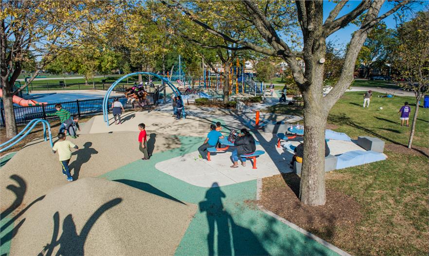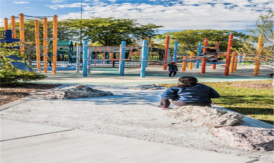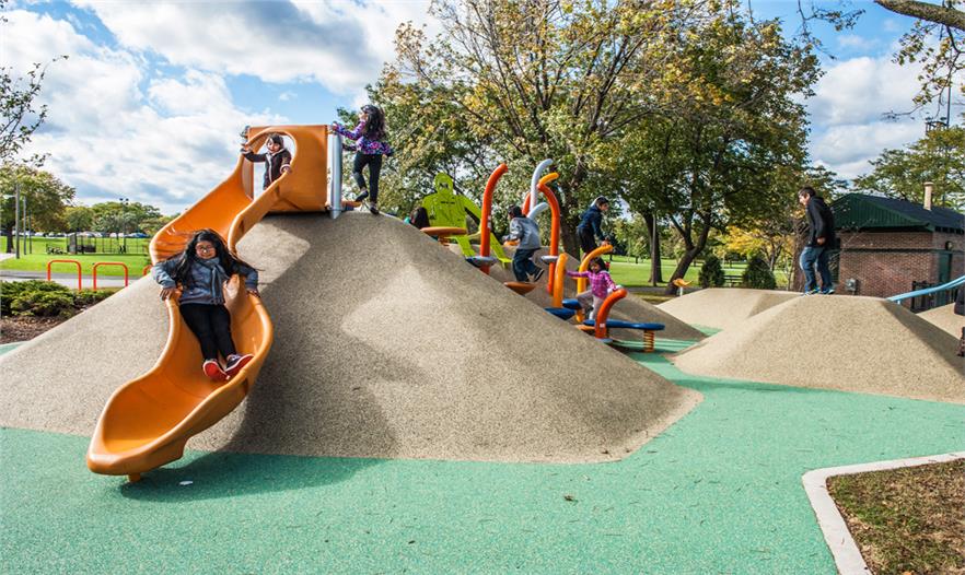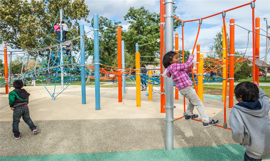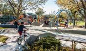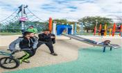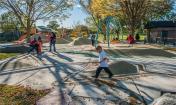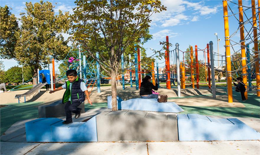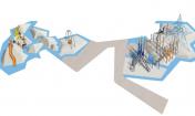 這個空間主題的探索性游樂場的特色是一個具有挑戰(zhàn)性的自然形態(tài)游樂區(qū)、巨大的網(wǎng)格結構、一個兒童溪流區(qū)以及特制的波浪狀座位區(qū)。