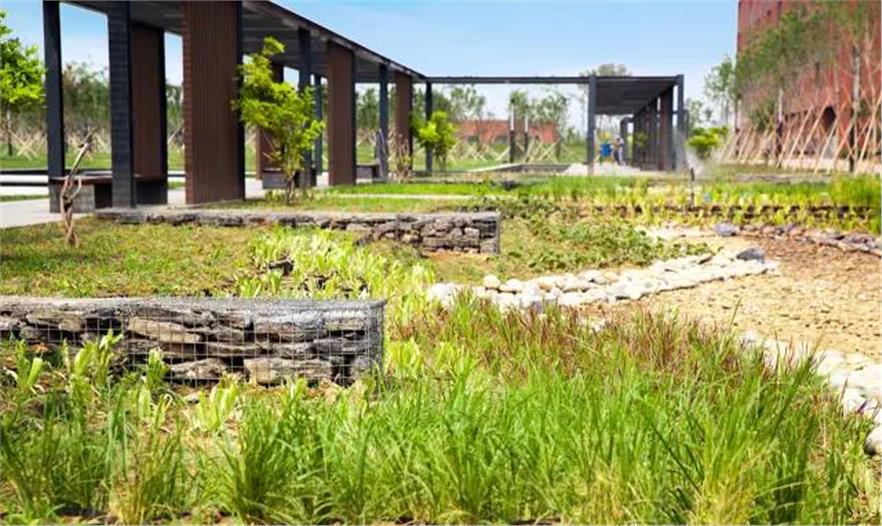 食堂南側(cè)雨水花園,設(shè)計(jì)師們通過對植物的選擇、墊層的改造“捕捉”雨水,通過對雨水的吸收、滲透、過濾,實(shí)現(xiàn)雨水資源化管理。