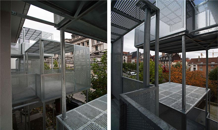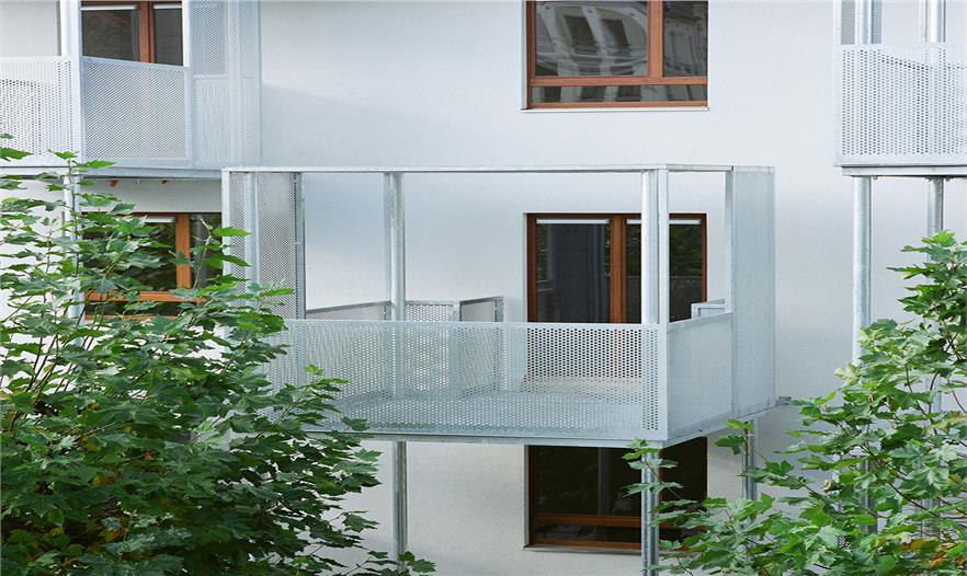 就像挑窗臺(tái),框架和穿孔片金屬的使用給從內(nèi)往外看提供了有效的透明度和從外往里看的不透明度?;镜脑硎墙ㄖ锏膫?cè)面必須保持可能。 這些陽(yáng)臺(tái)是淺灰色的,天花板可以使用白色的表面。接近表面的總體方法和額外的陽(yáng)臺(tái)提供了一個(gè)暫時(shí)的建筑表現(xiàn),其中變化可以清楚地看到,而他們尊重這些現(xiàn)存的高質(zhì)量的建筑。