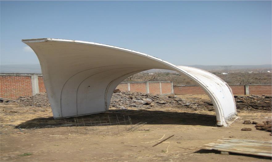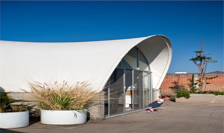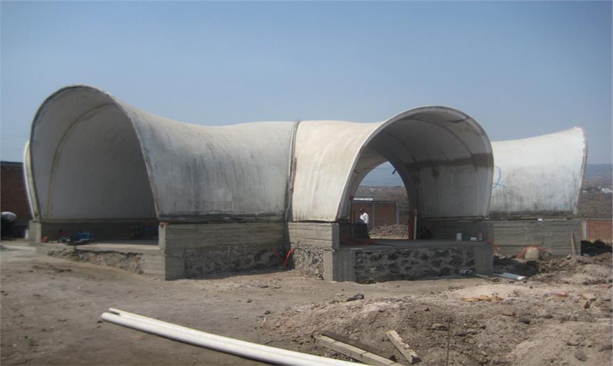 PRODUCTORA建筑事務(wù)所的一位朋友獲得了許多拋物型的結(jié)構(gòu),是從20世紀(jì)70年代他們常常歡度周末的一個(gè)模塊房子中回收來(lái)的,這個(gè)項(xiàng)目由此開(kāi)始。為了使用這六塊拋物線型模塊,戶主在一個(gè)小城鎮(zhèn)上購(gòu)買(mǎi)了一塊新地(距離墨西哥城只需1個(gè)小時(shí)),讓PRODUCTORA建筑事務(wù)所重組和回收這些纖維玻璃材料。