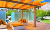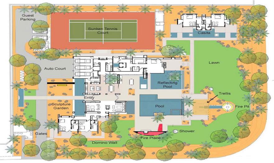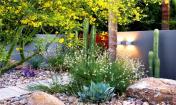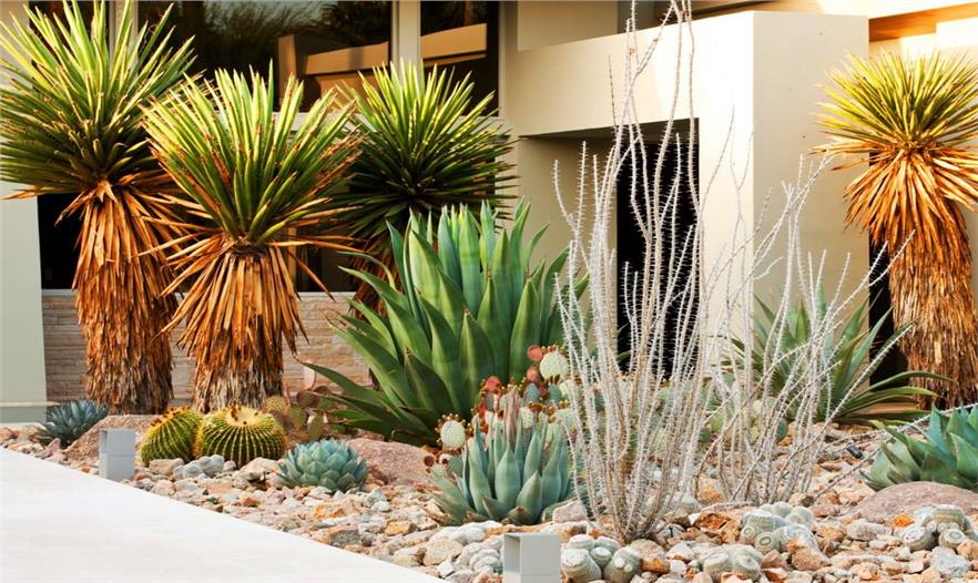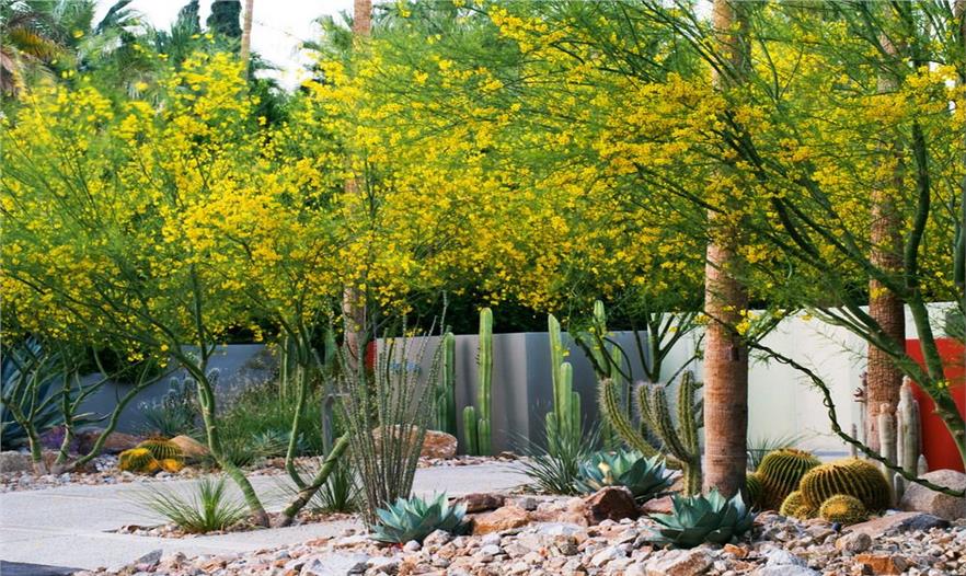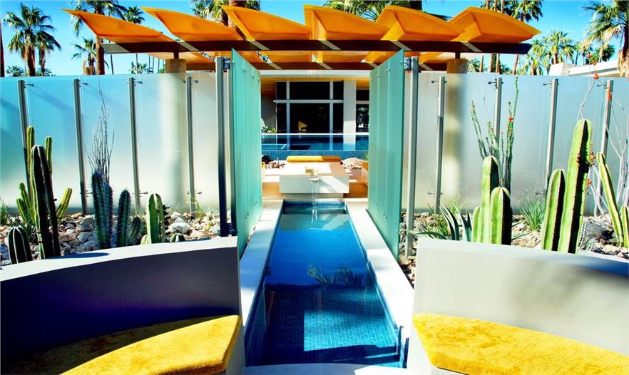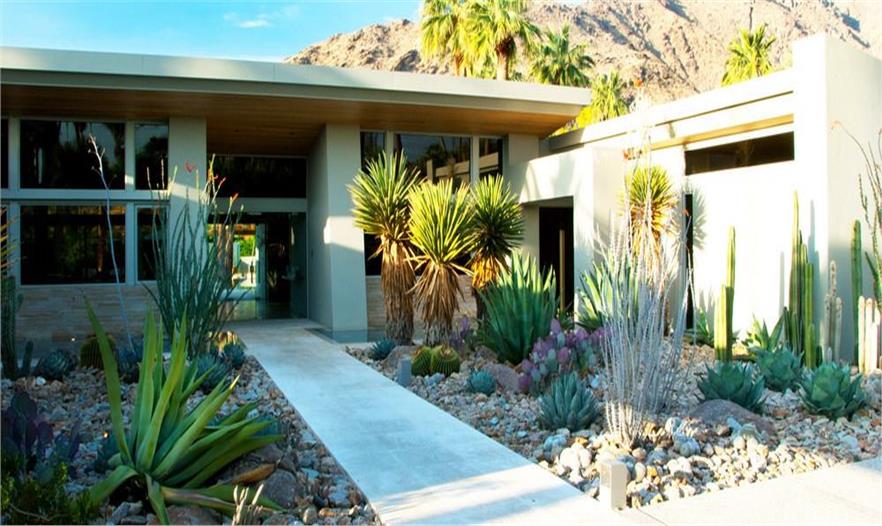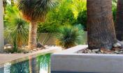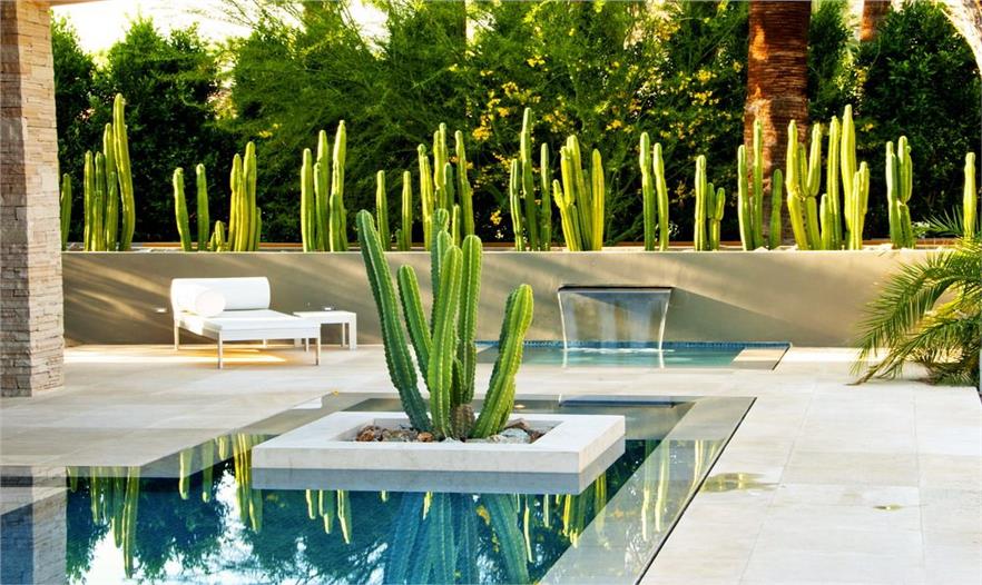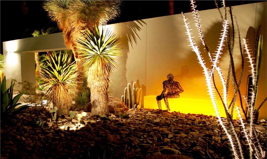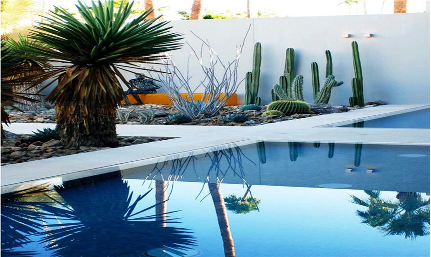 該項目住宅及庭園占地約0.6公頃,位于棕櫚泉風景秀麗的古拉斯帕爾馬斯住宅區(qū)內(nèi)。這是客戶方與設計方的二度合作,他們之間的首度合作是為一座中世紀現(xiàn)代住宅進行改造,因此,彼此間的信任感與默契度都有了一定程度的積累??蛻羝诖谠擁椖恐性O計方能夠呈現(xiàn)出最佳的景觀效果,并且希望通過生動而特別的景觀語言詮釋以提升其戶外生活質(zhì)量,以及沙漠植栽景觀的觀賞價值。水和光成為了這座沙漠植栽住宅庭園景觀設計中的兩大主要元素。主體戶外空間擁有開闊的視野,可欣賞到毗鄰的圣哈辛托山壯麗景致。園中各區(qū)域間形成空間的自然無縫對接,室內(nèi)外空間由小型滑動玻璃門分隔開去,且室內(nèi)的每一個房間都緊挨景觀庭園,即庭園空間以住宅建筑為中心點,漸而向四周延展,為室內(nèi)創(chuàng)造了理想的觀景視角。根據(jù)室內(nèi)房間各自不同的功能性,園中景觀從私密性到公共觀賞性,隨之相應變化著。
