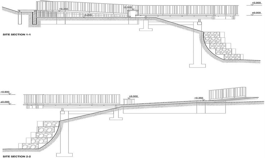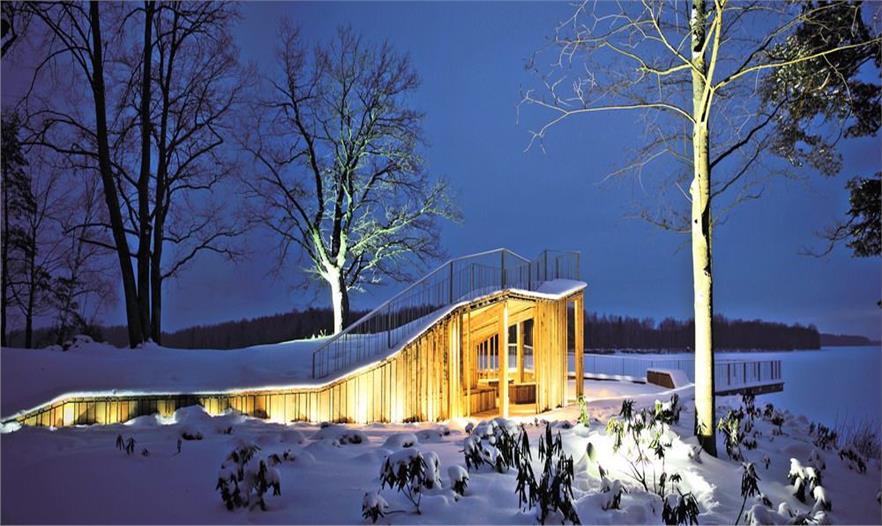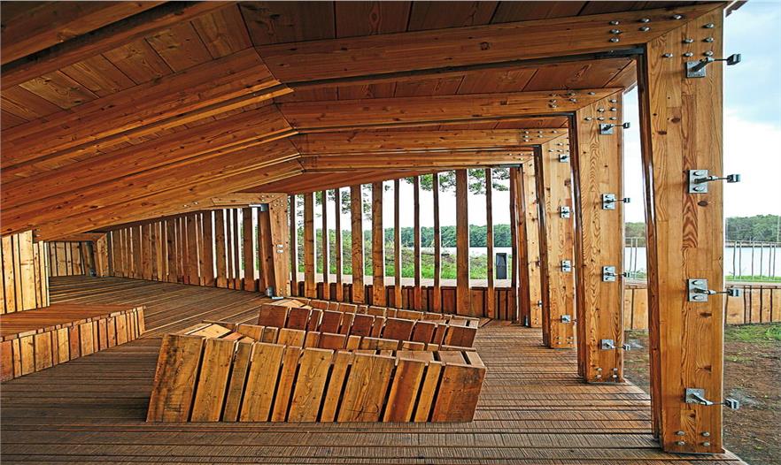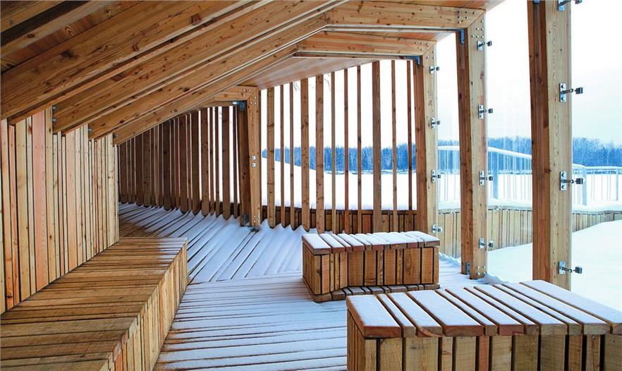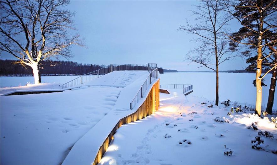 觀景露臺(tái)位于紀(jì)念公園“命運(yùn)花園”內(nèi),這個(gè)區(qū)域是整個(gè)島嶼項(xiàng)目中第一片用以慰靈的區(qū)域。命運(yùn)花園是一處拉脫維亞為上世紀(jì)的亡靈祭奠的紀(jì)念性場(chǎng)所,預(yù)計(jì)于2018年建設(shè)完成。它的建設(shè)是對(duì)國(guó)家成立100周年的獻(xiàn)禮。觀景露臺(tái)項(xiàng)目的建設(shè)投資全部來源于社會(huì)募捐,其設(shè)計(jì)方案也是由設(shè)計(jì)競(jìng)賽而產(chǎn)生。它是紀(jì)念公園內(nèi)最先建成的永久性建筑物。自然為拉脫維亞人民創(chuàng)造了內(nèi)在能量、力量、和平與和諧以及慰藉。在設(shè)計(jì)過程中,項(xiàng)目運(yùn)用了當(dāng)?shù)貥淠?、地貌等元素?chuàng)造出最為驚艷的視覺效果。觀景臺(tái)與觀景建筑將“開放性”層次變得更為多元化。這使得建筑在任何氣候條件下都能得到有效利用,同時(shí)也給予游客選擇的自由,讓他們?cè)谶m合自己的層次觀賞美景。設(shè)計(jì)師還設(shè)計(jì)了一個(gè)涼亭,使得它能從長(zhǎng)凳漸漸過渡到建筑。建筑本身也是人與自然間和諧互動(dòng)的平臺(tái)。觀景露臺(tái)這一項(xiàng)目在拉脫維亞最佳建筑作品獎(jiǎng)中榮獲年度大獎(jiǎng)。