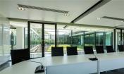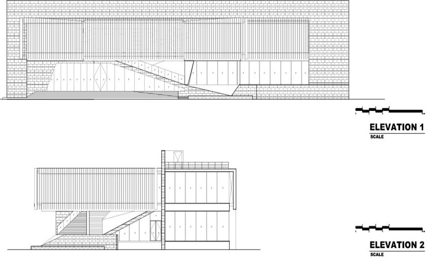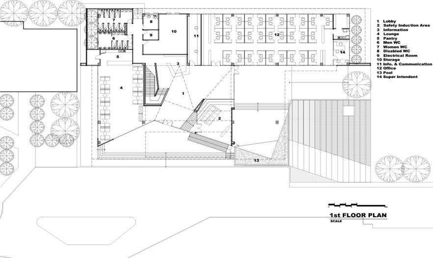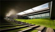 建筑位于油田的 入口處,占地2000平米,主要用作辦公。建筑師在地面上堆土造出綠草坡地,并把二層建筑架在騎上,形成一個(gè)擁有內(nèi)院的虛實(shí)建筑,人們在建筑中可以欣賞到內(nèi)部與外部的多層次綠景。在二層有一座廊墻聯(lián)系建筑的雙翼。大樓的辦公區(qū)域覆蓋著鋁格柵以防止過多太陽進(jìn)入室內(nèi),從而實(shí)現(xiàn)節(jié)能。