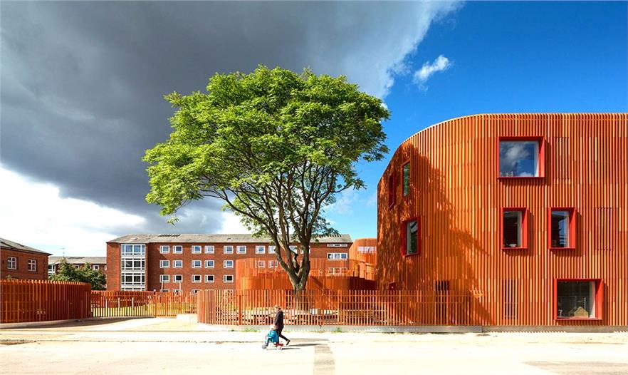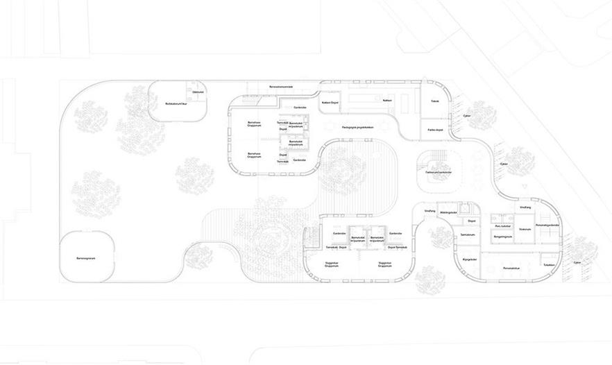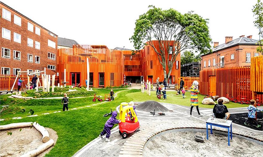幼兒園所在地區(qū)是哥本哈根老人院和老年社區(qū)集中的地方,因此設(shè)計(jì)也竭力讓幼兒園與周圍環(huán)境保持協(xié)調(diào)。很多人選擇在這里度過自己的晚年,導(dǎo)致的結(jié)果是這些人的兒孫輩們也在這里成長,開展自己的新生活。新幼兒園采用了統(tǒng)一的色彩,但是有對不同的是,建筑沒有采用傳統(tǒng)紅磚,而是用了垂直長條的薄磚。這種材料覆蓋建筑的外表皮,也延伸成為幼兒園庭院圍墻。其通透的柵欄式結(jié)構(gòu)允許光與風(fēng)的通過。這座容納了160位0-6歲幼童的幼兒園由5棟1-3層小建筑組成,每一個(gè)小建筑都擁有綠色屋頂和屋頂花園。從外面看幼兒園這里宛如一個(gè)統(tǒng)一高效的兒童村落——小型、緊湊、靈活、日常、精彩。