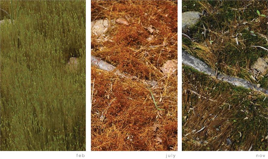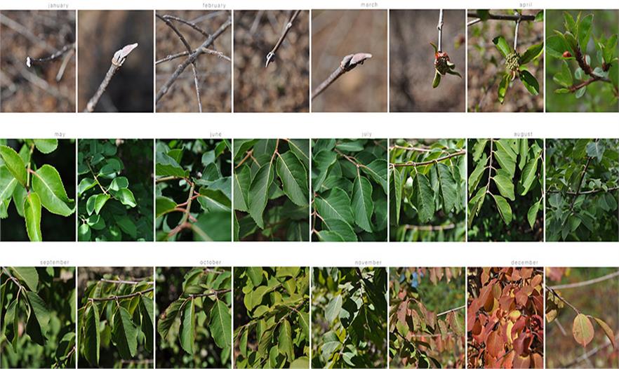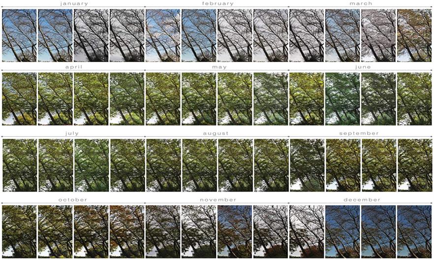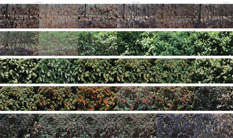 園藝愛(ài)好者和自然主義者已經(jīng)記錄了數(shù)年的季度觀察。在《沙郡年紀(jì)》(1949)中,阿爾多·利奧波德記錄到“今年我發(fā)現(xiàn)串葉松香草在7月24日第一次開(kāi)花,比平時(shí)遲了一周;在最近的六年內(nèi),平均數(shù)據(jù)是7月15日。”(第46頁(yè))我們的社會(huì)對(duì)花朵的根深蒂固的迷戀十分有趣,并且非常重要,但是這種全神貫注常常使得觀察者分心,從而未能觀察到植物表現(xiàn)的全部性能?,F(xiàn)有的物候數(shù)據(jù)集之中蘊(yùn)藏有豐富的未被利用的信息。物候?qū)W項(xiàng)目推進(jìn)了植物物候?qū)W的記錄,使其不僅限于對(duì)花開(kāi)日期的描述,并且捕捉到了每一物候事件期間植物的空間和結(jié)構(gòu)特性。通過(guò)每周的同樣時(shí)間在相同的制高點(diǎn)拍下的一系列靜止照片,記錄下了整個(gè)季節(jié)內(nèi)的植物的拓展調(diào)色板的短暫瞬間。迄今為止,已經(jīng)通過(guò)物候?qū)W項(xiàng)目記錄下了總共15,396張照片。僅有七張包含于本次提交中。