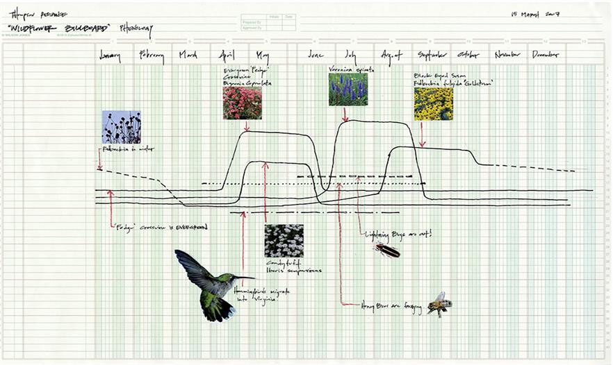 這些疊演嘗試圖解植物在整個(gè)季節(jié)的“姿態(tài)”,同時(shí)也捕捉到了城市生態(tài)學(xué)的成員到達(dá)此處參與集會(huì)的情景。