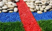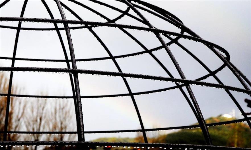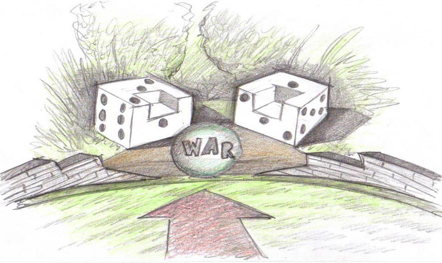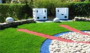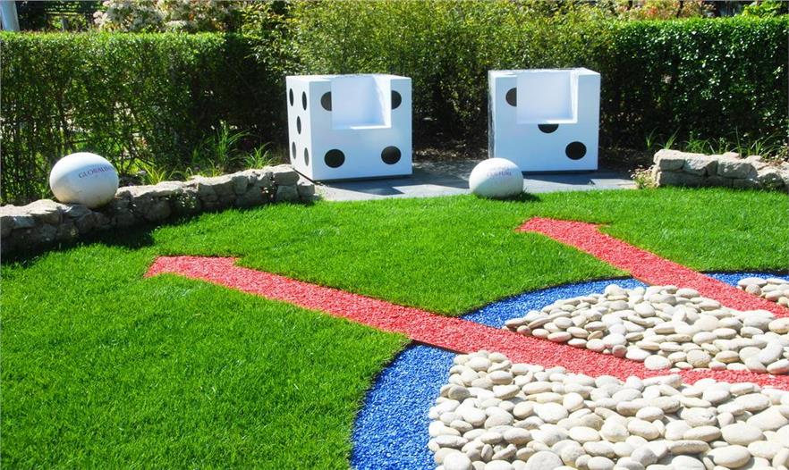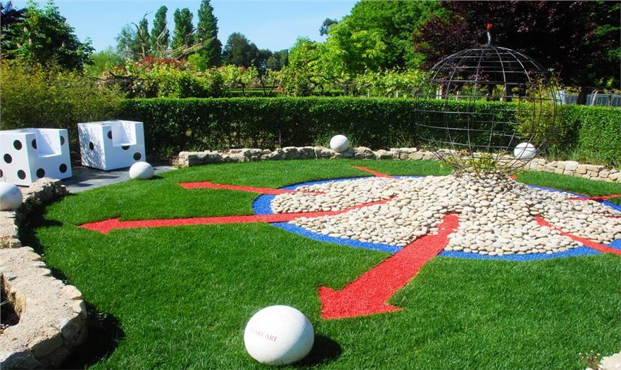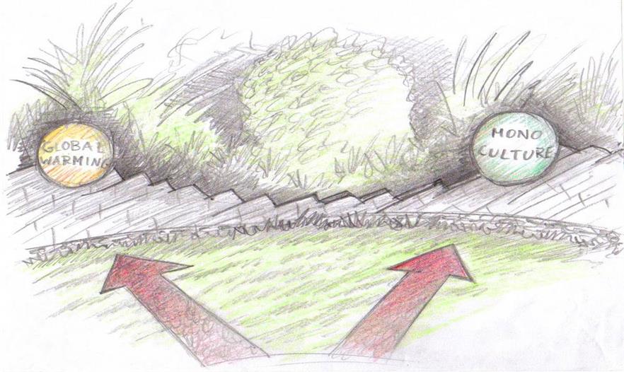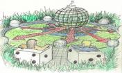 相對(duì)于營(yíng)造一個(gè)世外桃源,這個(gè)花園的設(shè)計(jì)著重表現(xiàn)了一些混沌世界中的混亂元素。設(shè)計(jì)的中心是一個(gè)大的金屬地球,代表地球,在一堆石塊上艱難地維持著平衡。從地球放射出一系列的箭頭,這些箭頭是紅色的,代表地球的命脈正在慢慢耗盡的。所有這些箭頭都指向在殘?jiān)珨啾谏厢пЭ晌5男∈?,每個(gè)球體代表一個(gè)挑戰(zhàn)現(xiàn)代社會(huì)和對(duì)世界造成無(wú)盡混亂的問(wèn)題:生態(tài)犯罪、砍伐森林、全球化、單一文化、全球變暖、戰(zhàn)爭(zhēng)、饑荒和移民。在花園的西南角有兩個(gè)大骰子樣子的座椅,雖然這個(gè)座位區(qū)的目的是用來(lái)觀(guān)察、休息和思考這個(gè)花園,它也清楚地暗示了我們?nèi)绾螌?duì)待我們的地球。藍(lán)色圓圈代表著海洋,綠色圓形草坪代表土地,而搖搖欲墜的邊界墻是代表人類(lèi)徒勞地嘗試控制自然。這也標(biāo)志著耕地和剩余的荒野之間的界限。