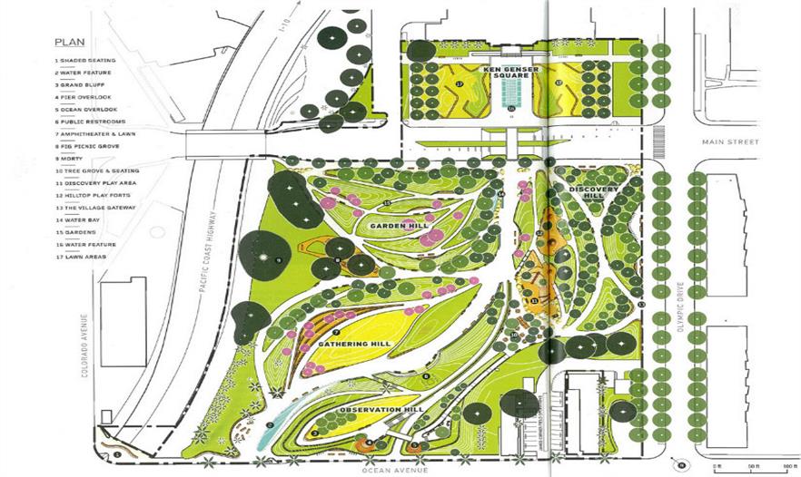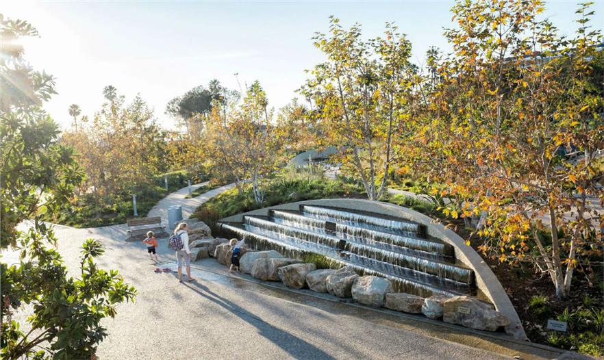 該公園的設計方案是在經(jīng)過一個寬泛的社區(qū)討論與加工之后才完成的,據(jù)悉,該公園的設計是從南加州的河谷景觀中得到的靈感,河谷的水流和溝壑形狀是該公園場地的雛形。