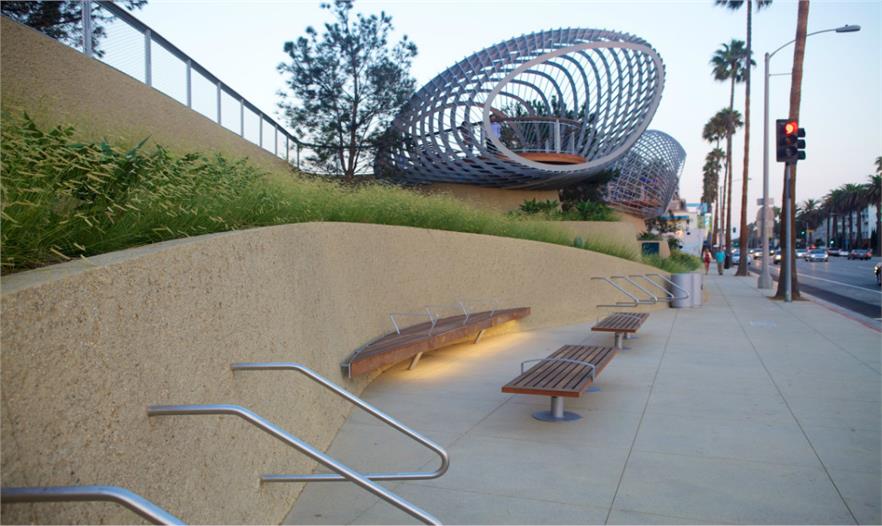 Tongva公園由英國景觀設計師詹姆斯(James Corner)打造,他最知名作品是紐約曼哈頓的高線高架公園(Highline Park),將老舊的高架鐵路改建成都市綠洲,圣塔莫尼卡的Tongva公園可看見他作品特色,善于利用空間高低起伏,營造時尚的空中花園。
