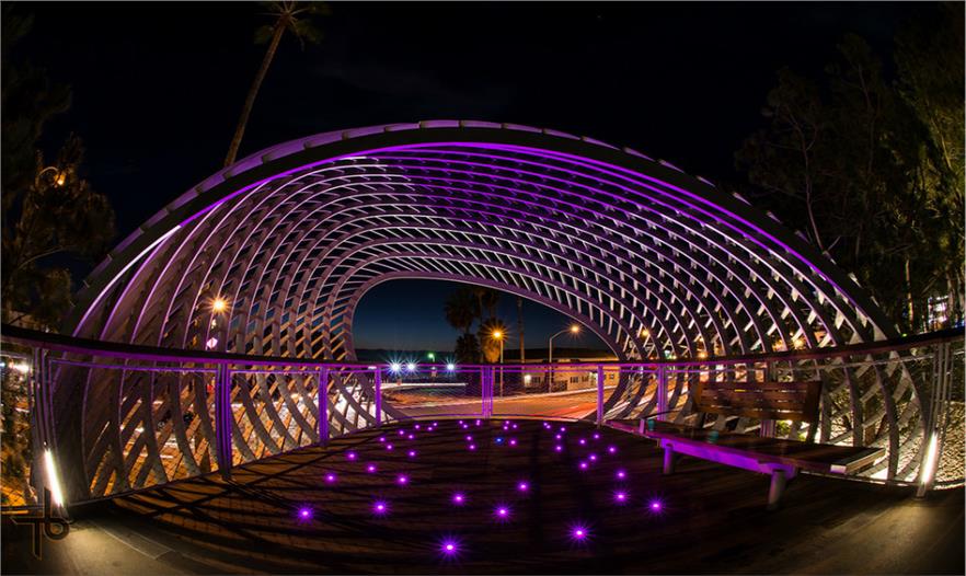 公園內(nèi)最吸引人注意的是造型新穎的觀景平臺,離地平面約18英尺,曲線型網(wǎng)狀涼亭,就像個編織的橢圓形籃子,民眾可站在原木打造的平臺上,俯瞰一望無際的太平洋丶圣莫尼卡碼頭上的摩天輪與海灘上的熱鬧人群。