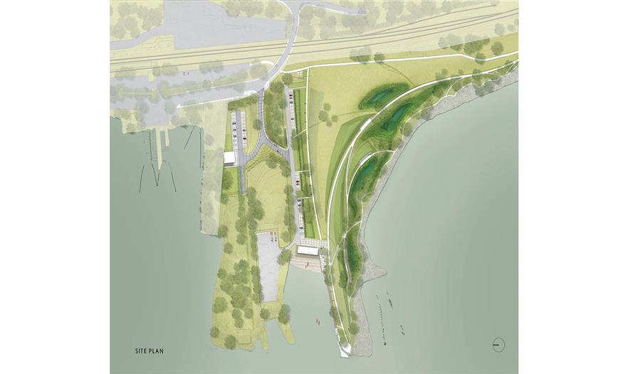 Beacon Point的雕塑裝置增強了該項目平靜海港南部邊緣的景色。現(xiàn)有退化的濕地被重新組織優(yōu)化生態(tài)功能,捕獲、保留、治理和釋放雨水徑流和風暴潮漫灘。大量的工程使其成為可能。它們對低地草地和潮間帶進行了實體分離,突出強調海岸線的弧形姿態(tài),構成濕地和潮池之間更加親近和多樣的空間。幾十塊被遺棄的混凝土石塊被重新安置用于鋪路,用于停車場或新皮艇租用亭附近的廣場。