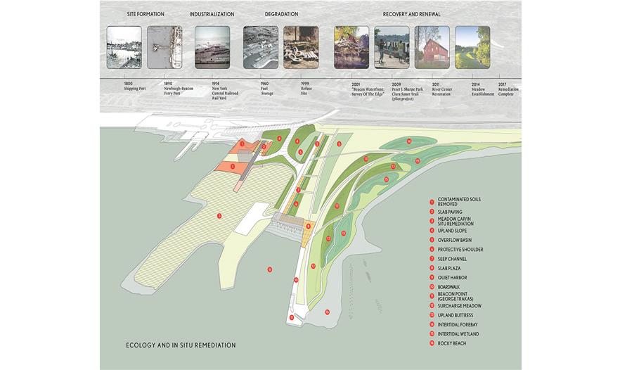 在20世紀的大部分時間里,該地產(chǎn)的土地利用持續(xù)變壞——從被遺棄的鐵路岔道和渡船站到燃料儲存區(qū)和囤鹽運作區(qū),再到汽車廢棄場。在20年前環(huán)境保護主義者開始整合土地、進行補救。大概10多年前,該設計團隊把它設想成一個功能景觀,修復生態(tài)功能,設計一個重要的藝術裝置,展示該河流的潮汐作用,這是在面臨海平面上升和頻繁暴雨時在退化區(qū)域改造濱河區(qū)域的最好的實踐活動。