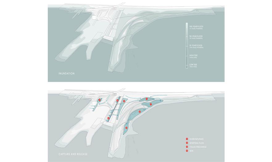 該區(qū)域向哈德遜河口深入305米(1000英尺),之前是具有反射美的區(qū)域(在夏季的晚上是該山谷最令人迷醉的區(qū)域之一)和一個暴露在外的半島。 暴雨一般會淹沒半島;每日會出現(xiàn)咸水上涌活動;冬季浮冰會受到極大的破壞。目標變得明確:建立彈性區(qū)域,但要逐步地完成——籌集資金、修復生態(tài)。