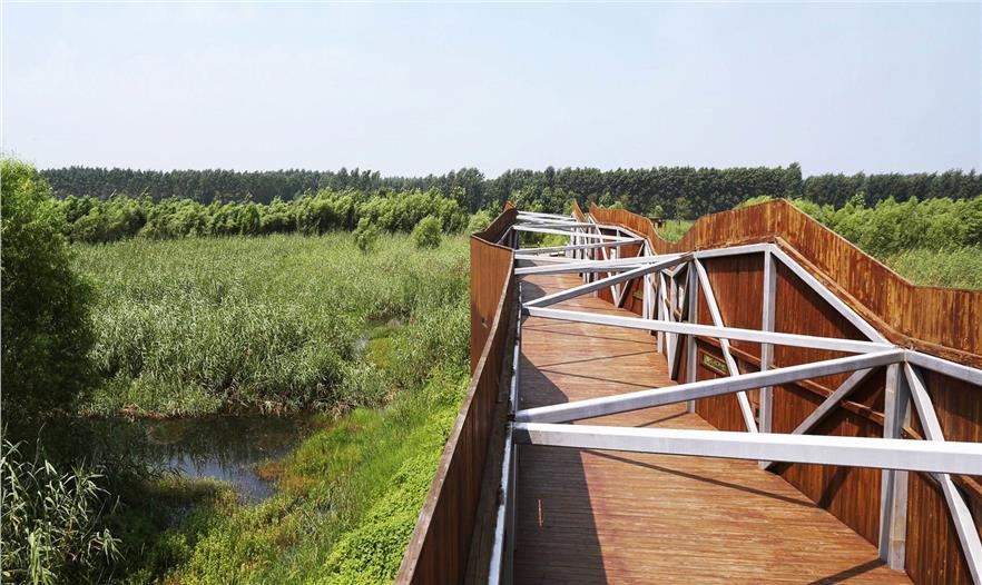 微山湖國(guó)家濕地公園為大型公園用地設(shè)立了一個(gè)新范例,平衡了社會(huì)變遷中的水體修復(fù)、濕地保護(hù)和旅游發(fā)展之間的關(guān)系。該區(qū)域(亞洲最大的湖泊濕地)因不好的農(nóng)業(yè)和水產(chǎn)養(yǎng)殖實(shí)踐逐年退化。其主要的設(shè)計(jì)目標(biāo)之一是修復(fù)水質(zhì)和區(qū)域濕地的環(huán)境。設(shè)計(jì)師將該公園從鄉(xiāng)村濕地區(qū)域改造成科學(xué)教育和生態(tài)旅游的目的地,刺激鄰近城市區(qū)域經(jīng)濟(jì)發(fā)展的同時(shí)也有助于中國(guó)南水北調(diào)工程沿線(xiàn)水道的環(huán)境保護(hù)。一旦這個(gè)項(xiàng)目完成,之前很少見(jiàn)的當(dāng)?shù)匾吧鷦?dòng)植物會(huì)再度回歸,助力水道修復(fù)、生態(tài)系統(tǒng)和棲息地的健康。