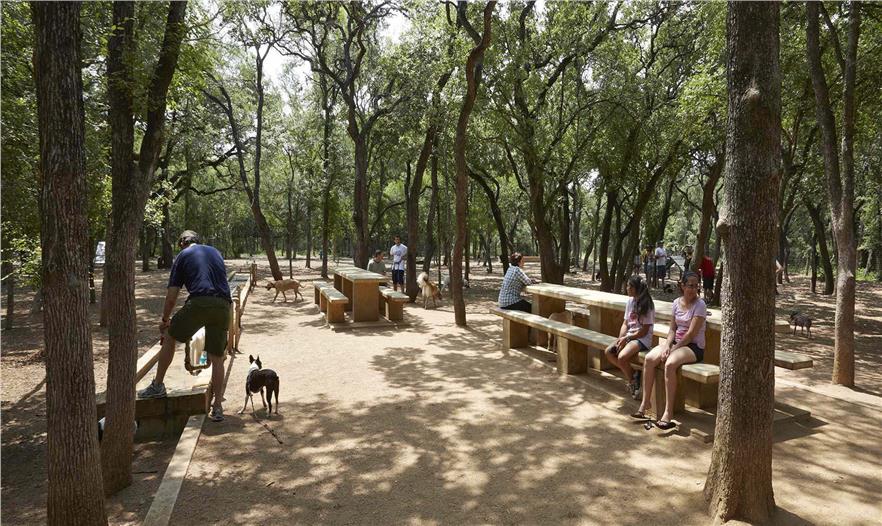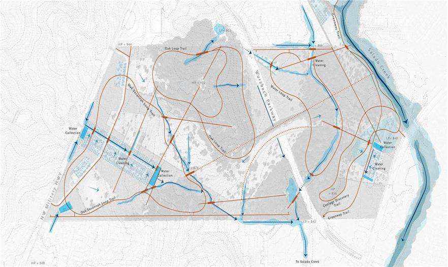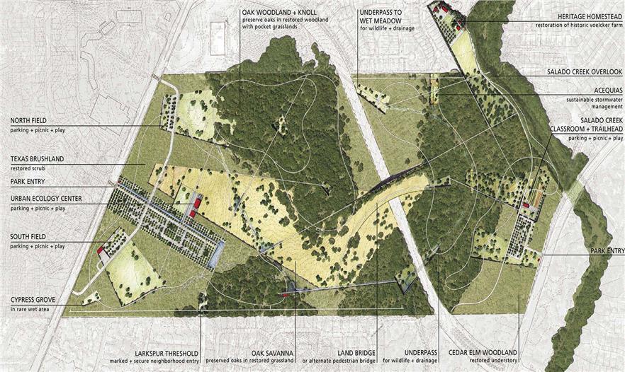 該公園經(jīng)一個(gè)6車道的機(jī)動(dòng)車道平分成2個(gè)地塊。東邊與莎拉多溪相鄰,通過莎拉多溪綠道與區(qū)域公園系統(tǒng)相連,還有一塊低洼的硬葉榆林地和分散的橡樹林。西邊是一大片的灌木林和入侵物種、橡樹林和暴露在外的石灰?guī)r。其他方向是緊密的社區(qū)和開發(fā)區(qū)。公園路下面現(xiàn)有的排水暗渠構(gòu)成野生動(dòng)植物廊道,將2個(gè)地塊連接起來。最后,一座紀(jì)念性的陸橋?qū)⒅匦逻B接這2個(gè)地塊。當(dāng)設(shè)計(jì)階段開始時(shí),牛群還在吃草,但大部分的區(qū)域由密實(shí)的灌木叢覆蓋。這些繁茂的下層植被與本土草原連接,阻礙了殘余的傳統(tǒng)的橡樹叢和硬葉榆林地的生長。其主要設(shè)計(jì)目標(biāo)是保護(hù)傳統(tǒng)林地、管理灌木叢林地以及修復(fù)本土橡樹草原。整個(gè)修復(fù)程序還與350個(gè)車位的停車場(chǎng)、野餐區(qū)、游樂區(qū)、運(yùn)動(dòng)場(chǎng)、狗公園設(shè)計(jì)規(guī)劃結(jié)合起來。