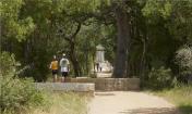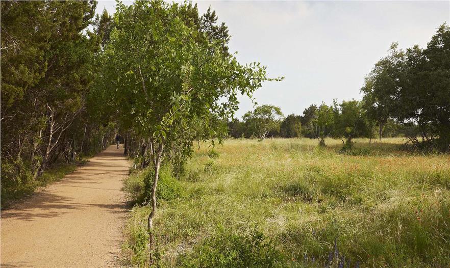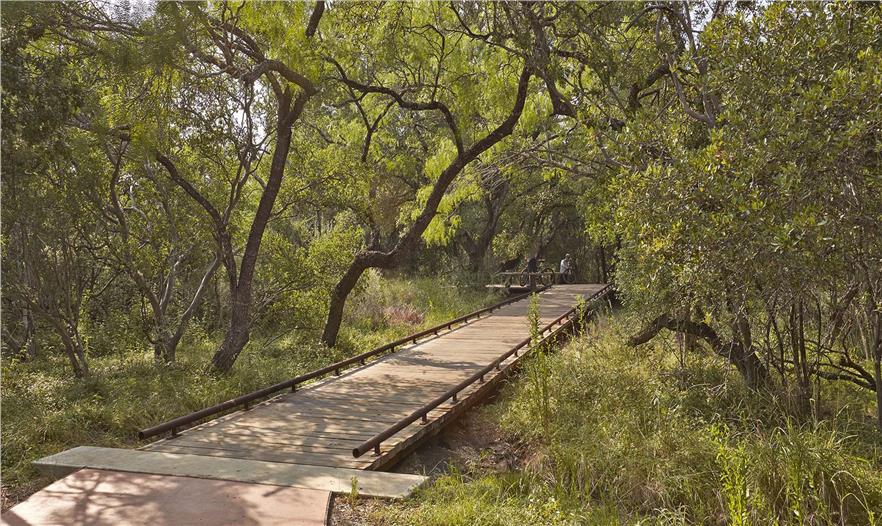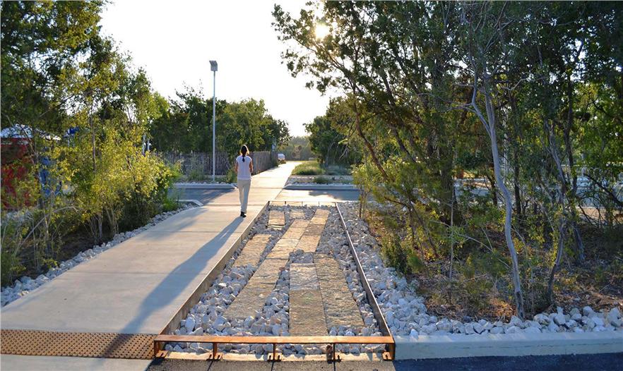 主要由本土風(fēng)化的花崗巖建造的10千米(6英里)長的通道橫穿林地,將2個(gè)地塊中新規(guī)劃的空間連接起來。在道路橫穿水道的地方上建造了木板路,而且道路系統(tǒng)尊重現(xiàn)有傳統(tǒng)的橡樹、柿子樹和硬木榆的生長,保護(hù)這些生態(tài)區(qū)。景觀設(shè)計(jì)師設(shè)計(jì)了一個(gè)綜合性的標(biāo)識(shí)方案,包括2個(gè)主入口標(biāo)志、環(huán)形道標(biāo)志、尋路標(biāo)志和解釋性標(biāo)識(shí)。使用的材料在該地區(qū)很常見,如Leuders石灰?guī)r、噴砂混凝土、原剛、雪松板,證明對(duì)圣安東尼奧本土景觀的尊重,將該項(xiàng)目與區(qū)域背景結(jié)合起來。