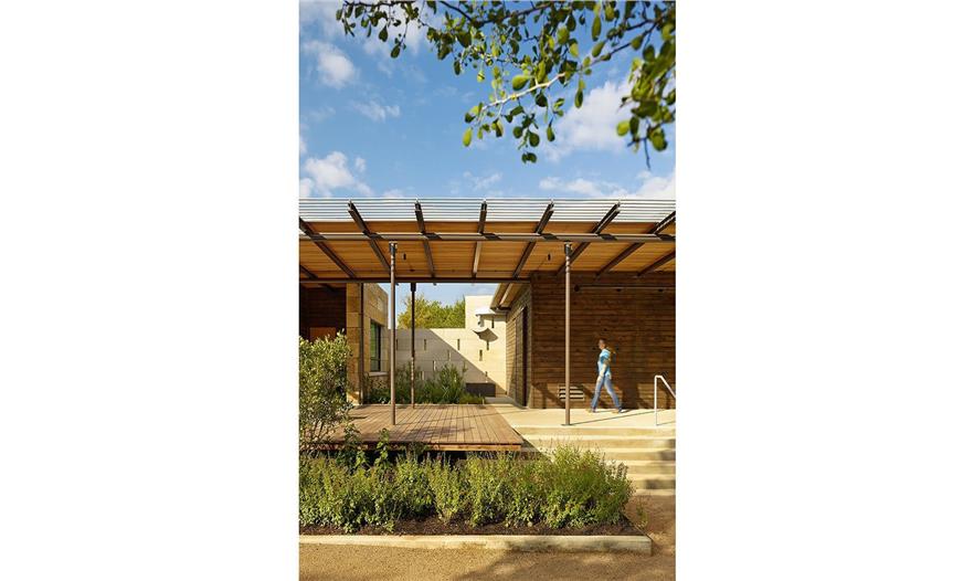 該公園的西面建造了一個(gè)1.728萬平方米(1.86萬平方英尺)的城市生態(tài)中心,為該社區(qū)提供了一個(gè)聚會(huì)空間,用于休閑和教育。這個(gè)最先進(jìn)的設(shè)施包括室內(nèi)和戶外教室、聚會(huì)廳、衛(wèi)生間、野餐區(qū)和停車場(chǎng),都是按LEED標(biāo)準(zhǔn)設(shè)計(jì)和建造的。建筑師和景觀設(shè)計(jì)師緊密合作,確保該建筑嵌入到現(xiàn)有的橡樹草原和灌木景觀中。一個(gè)連接元素是“大溝渠”,設(shè)有石灰?guī)r石筐和耐候鋼,捕獲和收集所有的停車場(chǎng)雨水徑流。這個(gè)183米(600英尺)長的生態(tài)濕地是由本土草本植物構(gòu)成,橫穿機(jī)動(dòng)車橋和人行橋,提供了大型景觀結(jié)構(gòu)如何替代傳統(tǒng)的雨水基礎(chǔ)設(shè)施的范例。