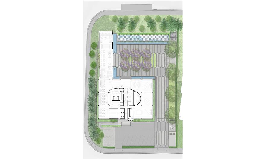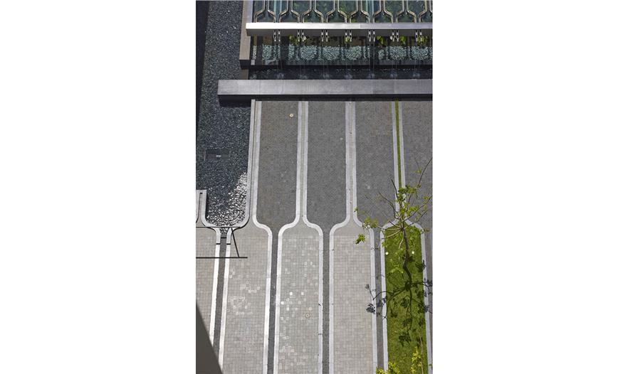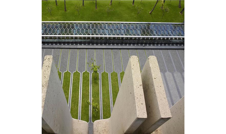 這個庭院以各種新方式融入建筑,以地面的鋪設和新的高架水景設計致敬藝術家Ossipoff的外觀模式。原始景觀沒有完全實現(xiàn),直到瀝青路面的停車場上Ossipoff漂亮建筑的重現(xiàn)。從新陽臺(夏威夷本土景觀類型)看,這個相互連接的庭院能靈活地用于活動和日常生活,建造出遠離城市環(huán)境的區(qū)域。這個線性的水景掩蓋前景,同時營造出海平線的感覺,展現(xiàn)白天日光的活動。鋪裝圖案呈現(xiàn)出相同的火山石的3種動態(tài)特征,突出該區(qū)域扎根于夏威夷地理起源。庭院中的石頭表面進行磨光處理,捕捉太陽光;或進行火燒,當從高處觀看時呈現(xiàn)出暗色但會發(fā)光;或開裂,崎嶇斑駁,記錄白天和晚上光線的轉(zhuǎn)變。