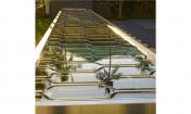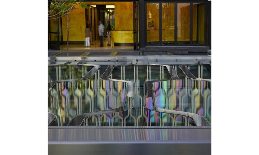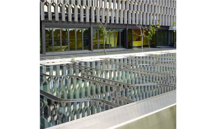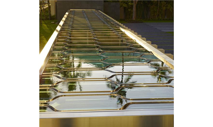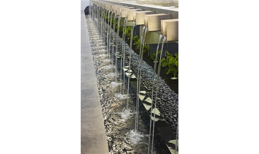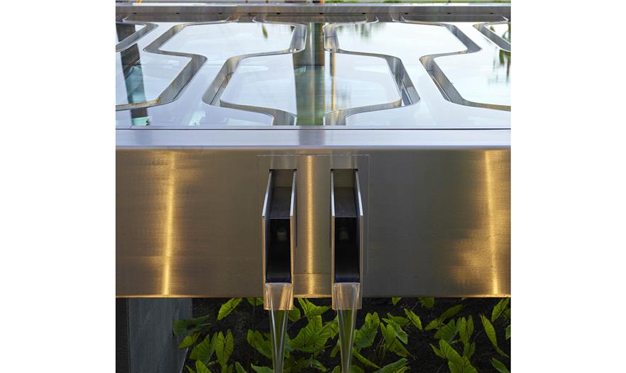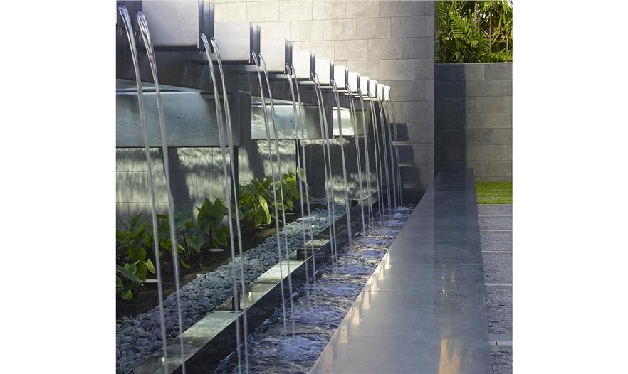水景是與該區(qū)域背景的視覺和體驗式連接,展現(xiàn)周圍的大海和不斷變化的海島天空。該水景提供了融入建筑的新方法,展現(xiàn)日光的移動性映像,捕捉建筑立面,把它投射成該區(qū)域新的動態(tài)水平線。這個可聽、可視的屏障掩蓋了汽車噪音和鋪裝路面。Alamoana大道遠處海灘的波浪看起來直擊其水面。水映射出白天和晚上的建筑和天空景象,突出鋼鐵水渠的形狀。該建筑形式將噴水與護城河結(jié)合起來,營造出庭院漂浮在空中的幻象。護城河是由高架噴泉邊緣沿線的一排排水口供應水源。